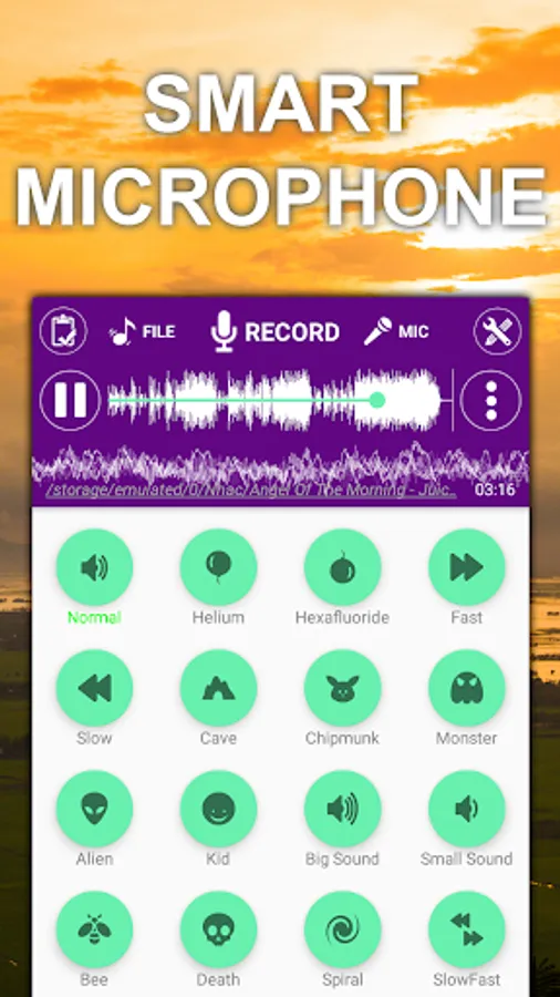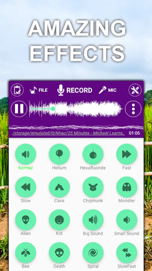 Amazing effects: normal, helium, hexafluoride, fast, slow, cave, chipmunk, monster, alien, big sound, small sound, bee, death…