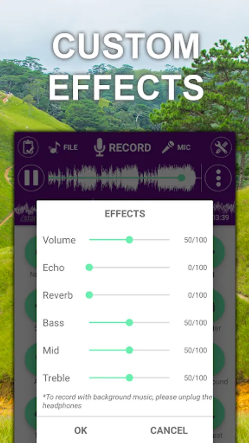 Custom sound with effects: echo, reverb, pitch, tempo, volume, bass, mid, treble