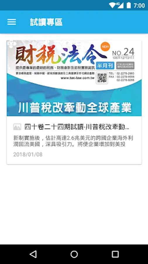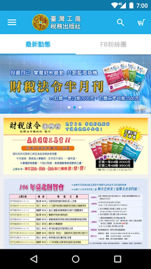 為讓使用者更加便利,台灣工商稅務出版社也跟進使用手機APP讓各位使用者能夠更快速的尋找並購買您需要的書籍,且能夠隨時注意我們提供的最新課程。在APP內提供月刊試讀,以及上課片段影片。