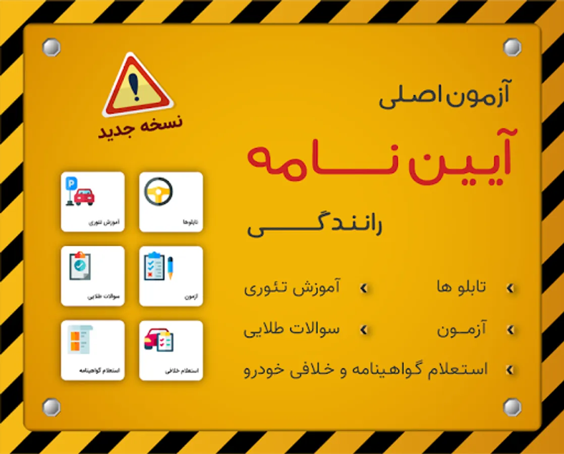 اپلیکیشن آیین نامه رانندگی شامل تمام بخش ها و موضوعات جهت قبولی و اخذ گواهینامه ماشین و موتور است. بخشهای مختلفی که در اپلیکیشن آزمون آیین نامه اصلی راهنمایی و رانندگی وجود دارد شامل:
