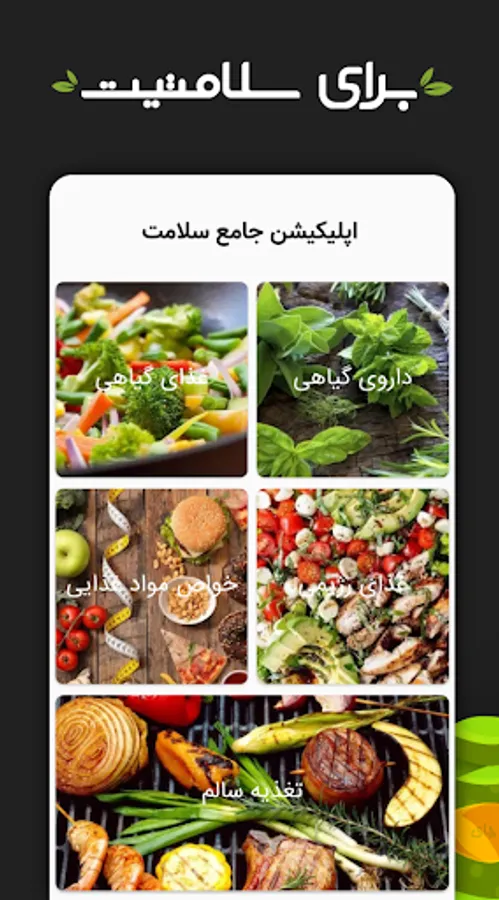 اگر به دنبال اطلاعات مفید در خصوص خواص گیاهان دارویی هستید، یا دنیال کسب اطلاع از خواص مواد غذایی می باشید، یا برای چاق و لاغر شدن برنامه دارین و دنبال غذاهای رژیمی هستید، یا بطور کامل گیاهخوار شدین و دنبال کاملترین لیست غذاهای گیاهی هستید، و بطور کل اگر دغدغه داشتن تغذیه سالم و سالم زندگی کردن رو دارین، "اپلیکیشن جامع سلامت" تمام این اطلاعات را در اختیار شما قرار میدهد.