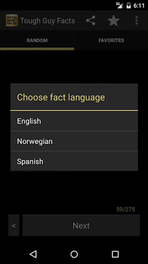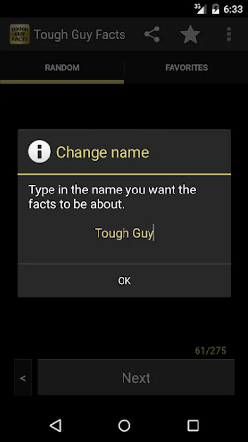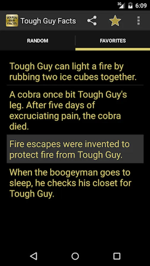 You can mark facts as favorites and share them easily with your friends. You can even replace "Tough Guy" with your own name or with the names of other tough guys.