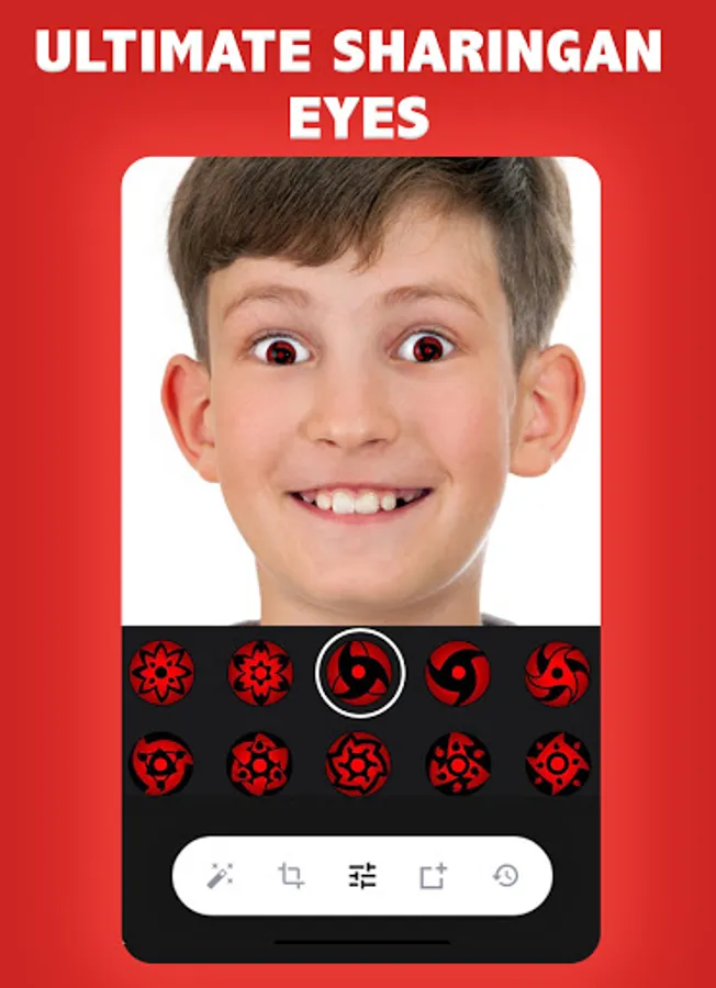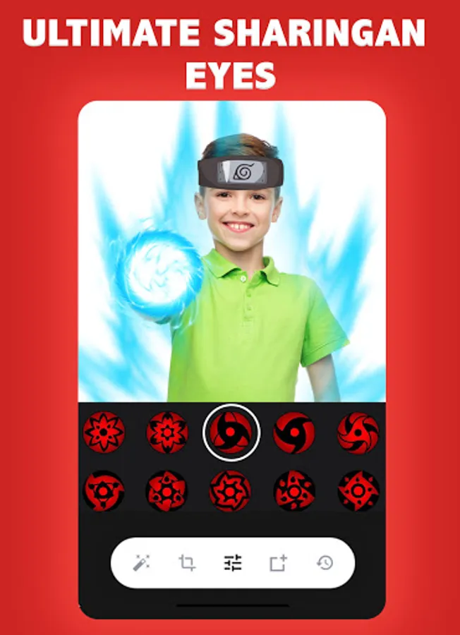 Do you like animes character with cool sharingan eye? Enjoy editing your own sharingan eyes with this anime app.