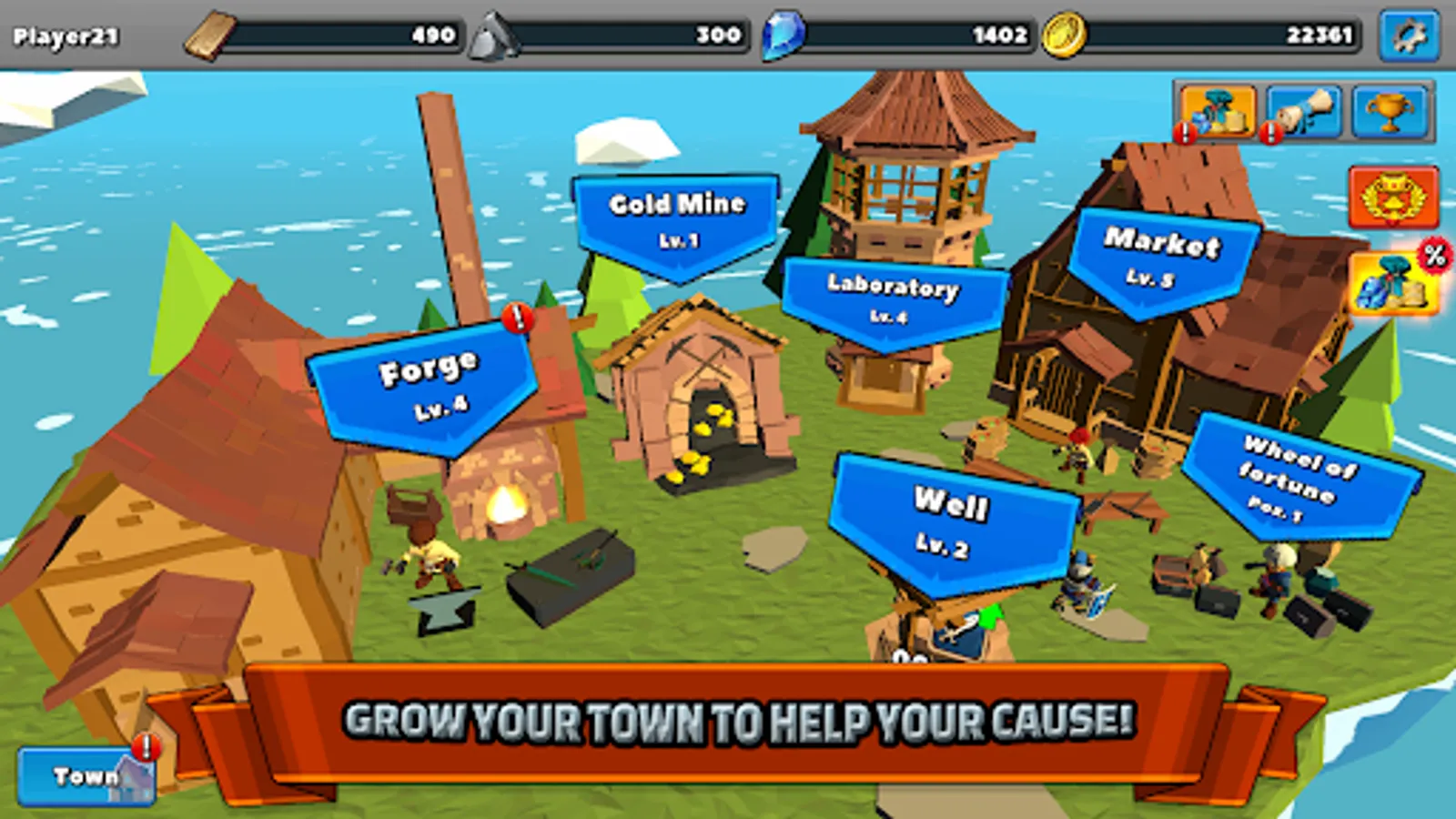 Collect wood and stone to grow your town. Unlock amazing buildings like shops, laboratory and more. Become a king in your fantasy world!