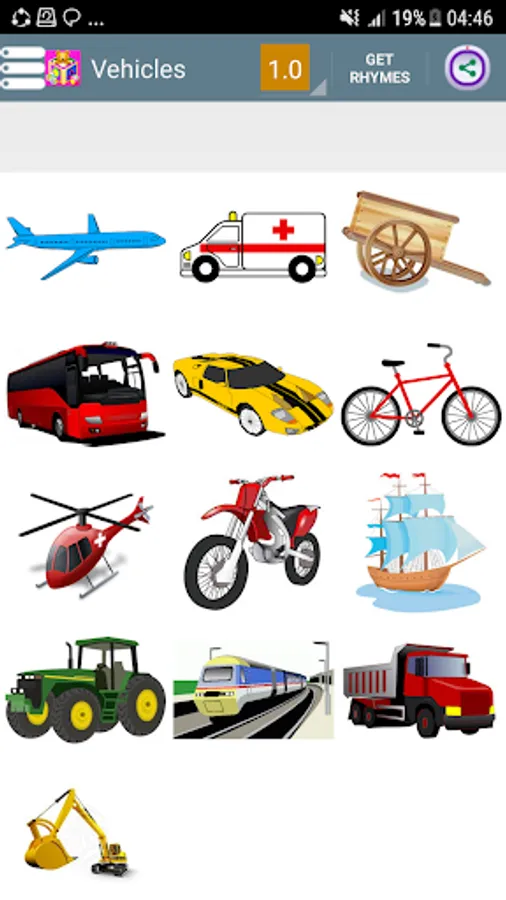 11. Vehicles Tractor, aeroplane, Truck, Car, Helicopter, Train, Bike, Cycle, Evacuator.