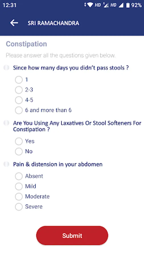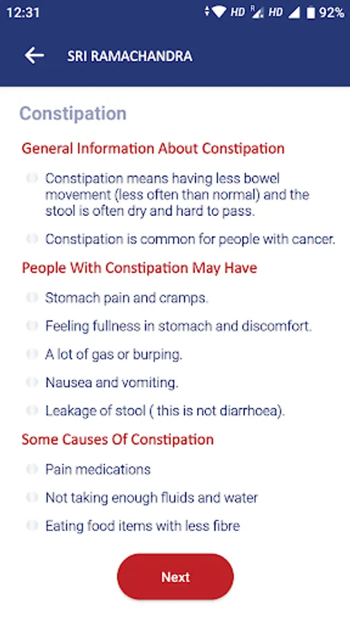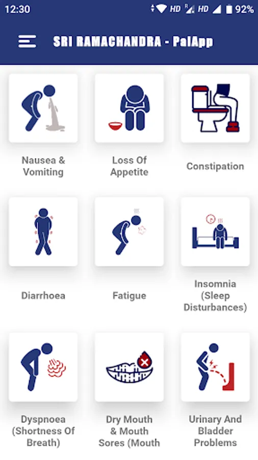 The App helps you (Cancer patients) to carry out the self-assessment of symptoms severity (condition). Based on this the App provides the management guidelines that varies from simple home based care, referral services or If the symptoms are severe the patients can come immediately to the hospital and consult the doctor.