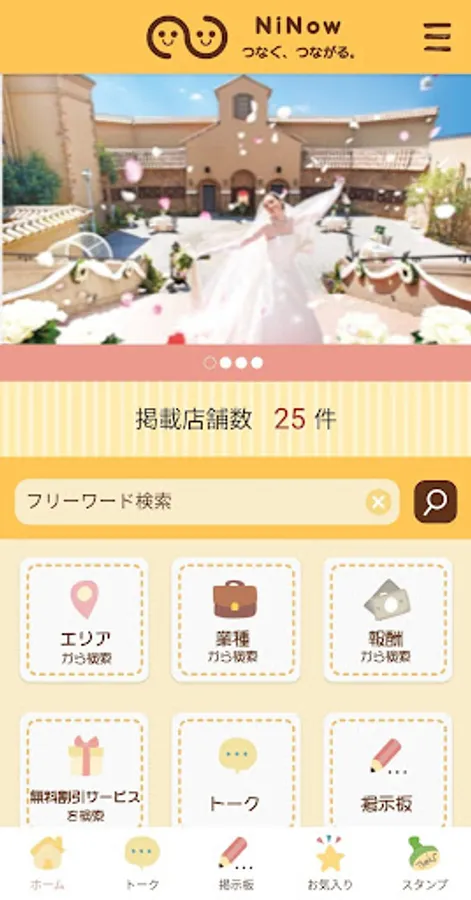 “NiNow” is free and you can enjoy talking with friends and stores. In addition, information can be distributed on the bulletin board and contacted easily. Delivery of store information with push notifications, coupons and stamp cards can be issued.