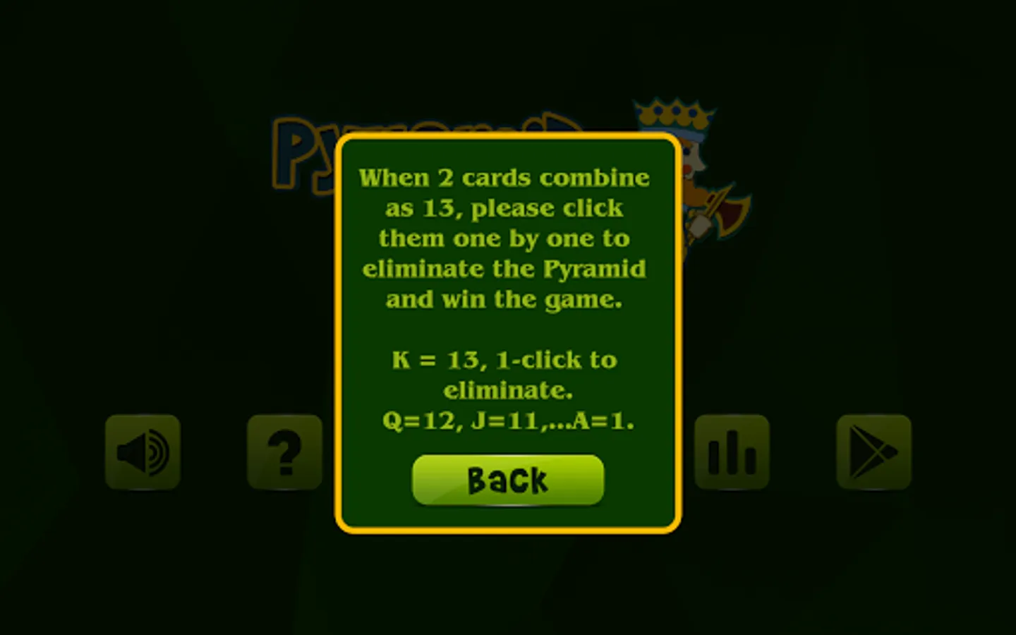 You need to match two cards as 13 to eliminate the cards. And there is a Pyramid which is full of cards. If you want to know how to play it, just try Alex Pyramid Solitaire.