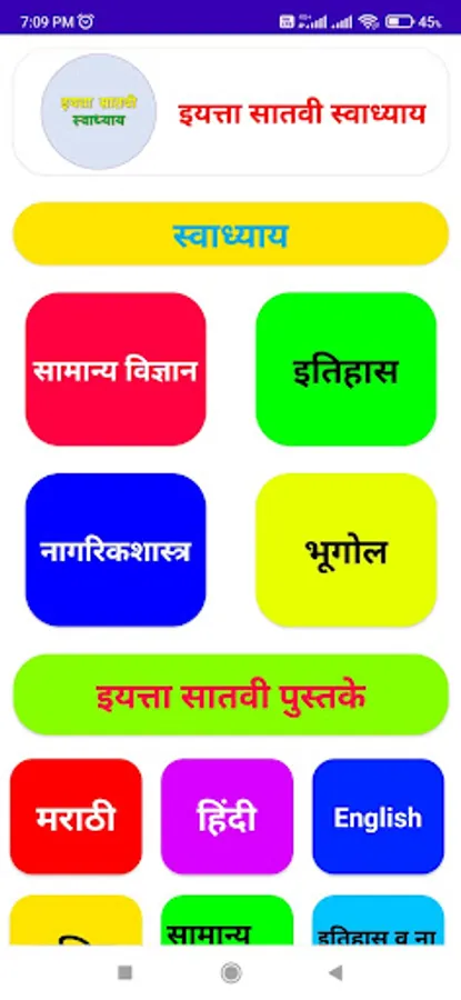 In iyatta satvi swadhyay app available a samanya vidnyan itihas and nagarikshatra and bhugol swadhyay are available. Also in this app available iyatta satvi pustke.