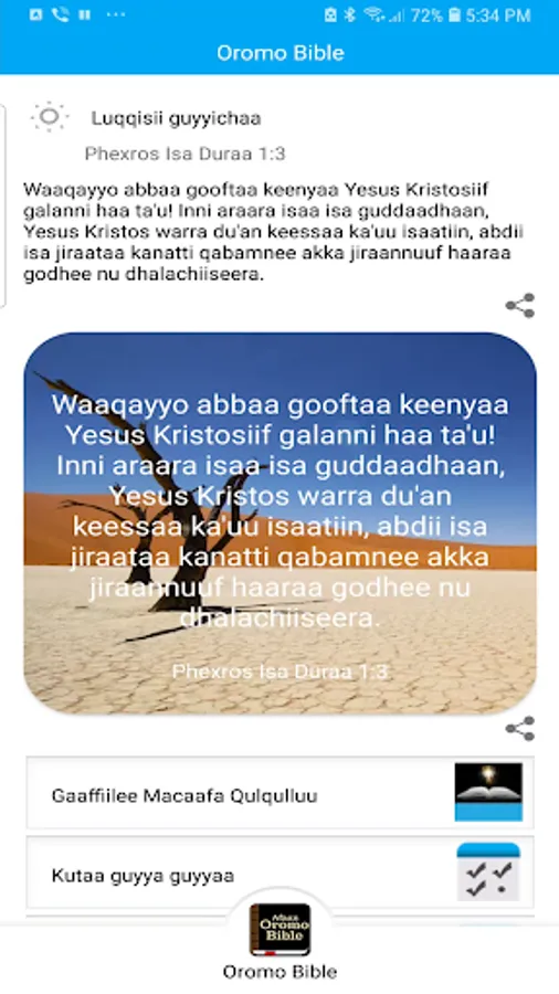 We are happy to offer Oromo Bible for your android devices. It comes with essential features, utilizing the power of android device for Oromo speaking community. This app is made possible and freely available by the assistance and sponsorship of the Union of Oromo Evangelical Churches of Europe (UOECE).