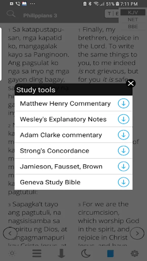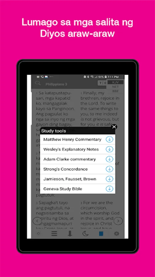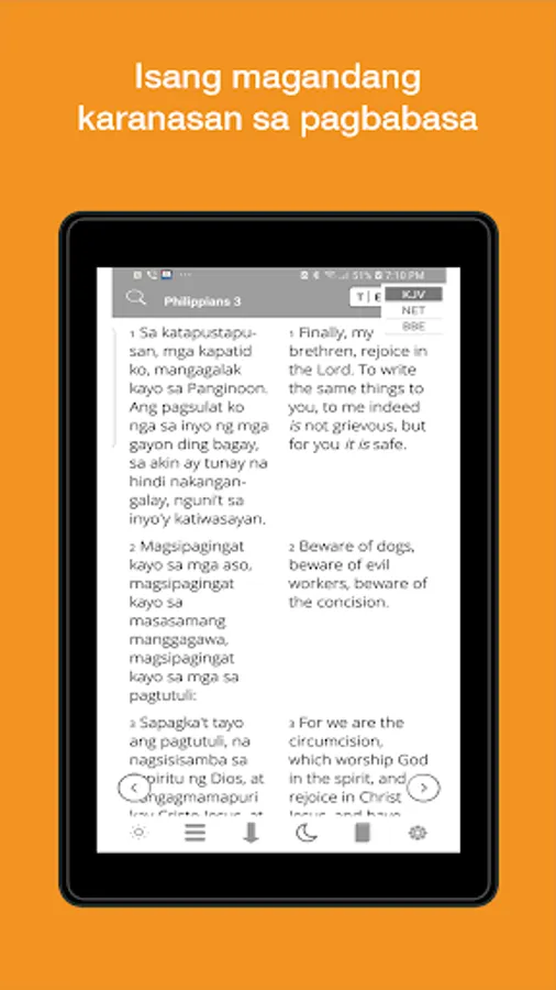 Apart from your favorite Tagalog Bible, access other English Bibles like KJV, NET, BBE without an internet connection.
