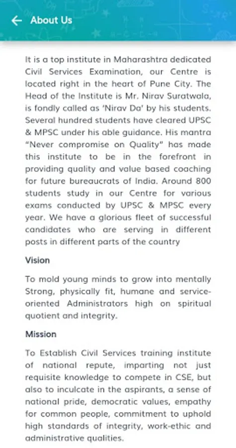 It is top institute in Maharashtra dedicated Civil Services Examination, our Centre is located right in the heart of Pune City. Head of the Institute is Mr. Nirav Suratwala, is fondly called as ‘Nirav Da’ by his students. Several hundred students have cleared UPSC & MPSC under his able guidance. His mantra “Never compromise on Quality” has made this institute to be in the forefront in providing quality and value based coaching for future bureaucrats of India. Around 800 students study in our Centre for various exams conducted by UPSC & MPSC every year. We have a glorious fleet of successful candidates who are serving in different posts in different parts of the country