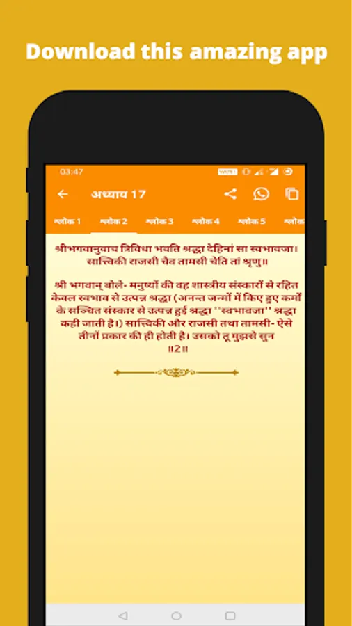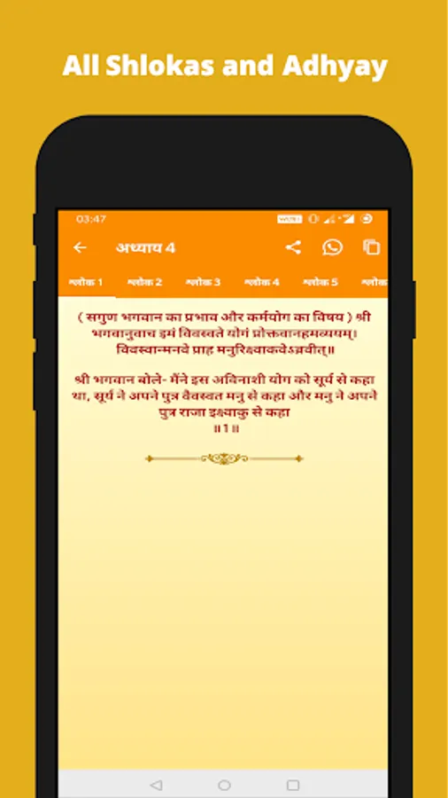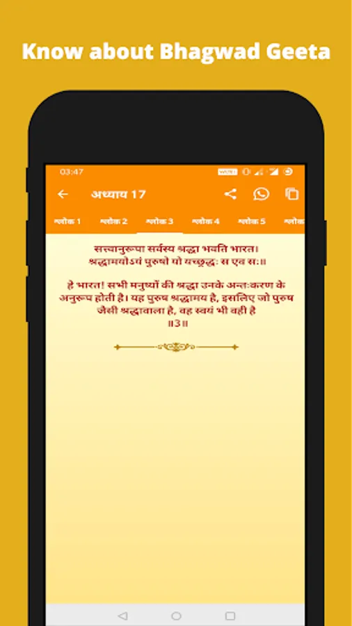 • Share feature to easily send your favorite Bhagavad Gita shloka / verse to your friends