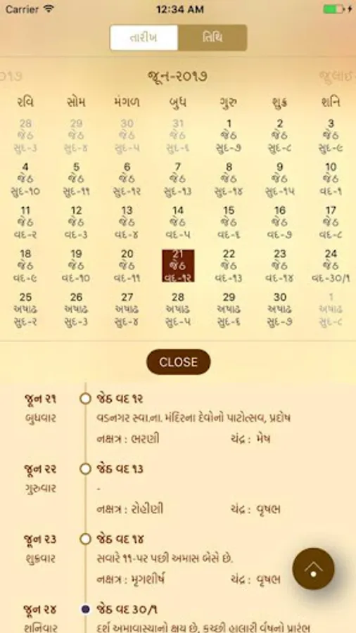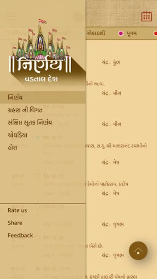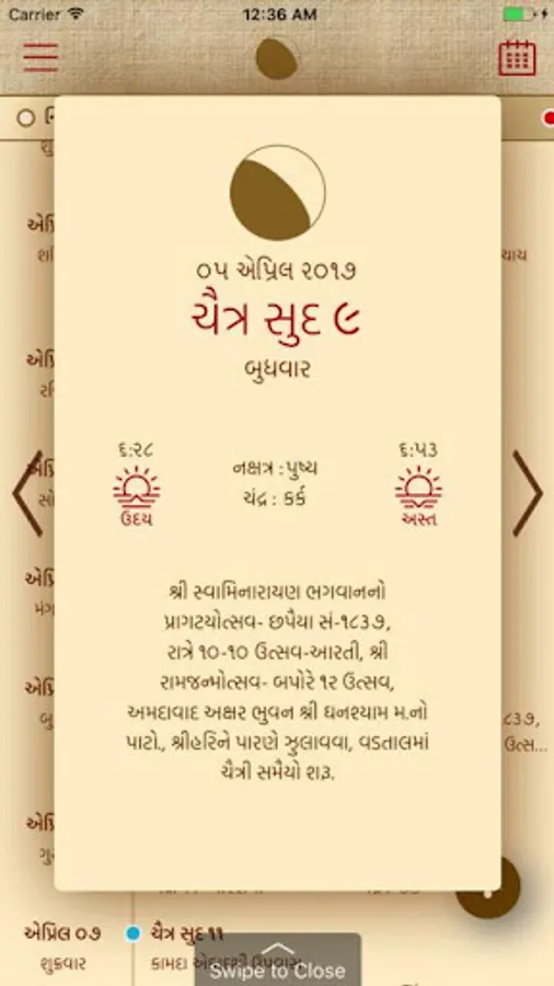 A simple Gujarati (Hindu) calendar with the traditional print copy look and feel but with the added benefit of user interaction to find more details about a specific date. The calendar will help you to find when the next Ekadashi is, what the Paksha (Sud,Vad) on a particular day is, when the next Poonam is (Full Moon) or the next Amavasya is and many more Hindu events in easy visual representations; due to images being used to represent key events, even a person who cannot read Gujarati is able to use the app.
