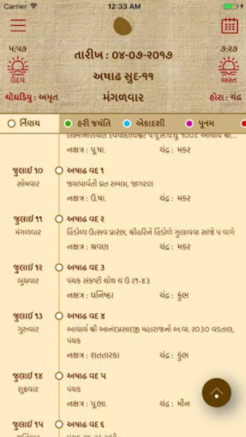 Nirnay (also known as the Panchang,an indian almanac) Provides information daily movment of the stars, for the hindu Samvat calendar year 2074-2075 The year starts from Chaiter Sud-1(18 March 2018)and end on the Fagun - amas(5 April 2019). Notification for Ekadasi,Amas,Poonam,Diwali,Holi,Dhueti, and major festivals, as well as displaying tithi (panchang) on the Android Mobile screen