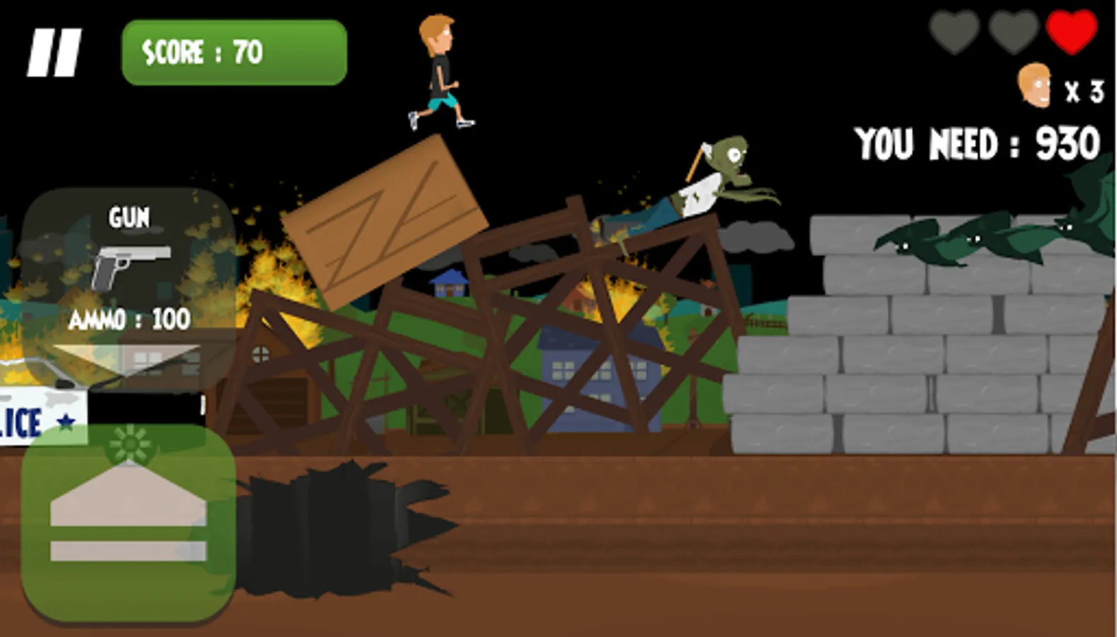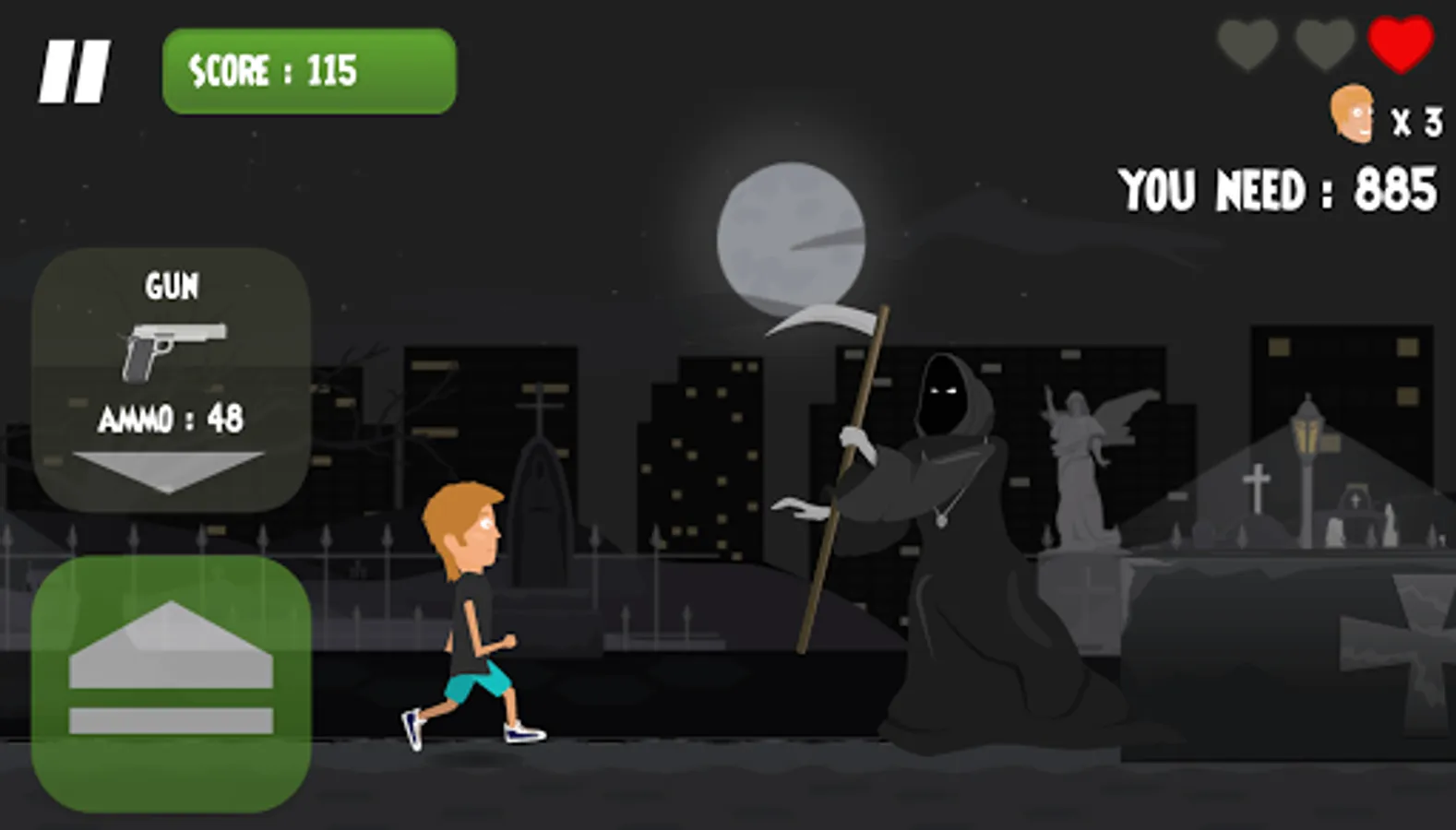 Your left hand will be in charge of jumping at the right time (to jump, you must press the green button), without falling through holes, dodging obstacles, climbing platforms and jumping over your enemies when you run out of ammunitions to shoot them.