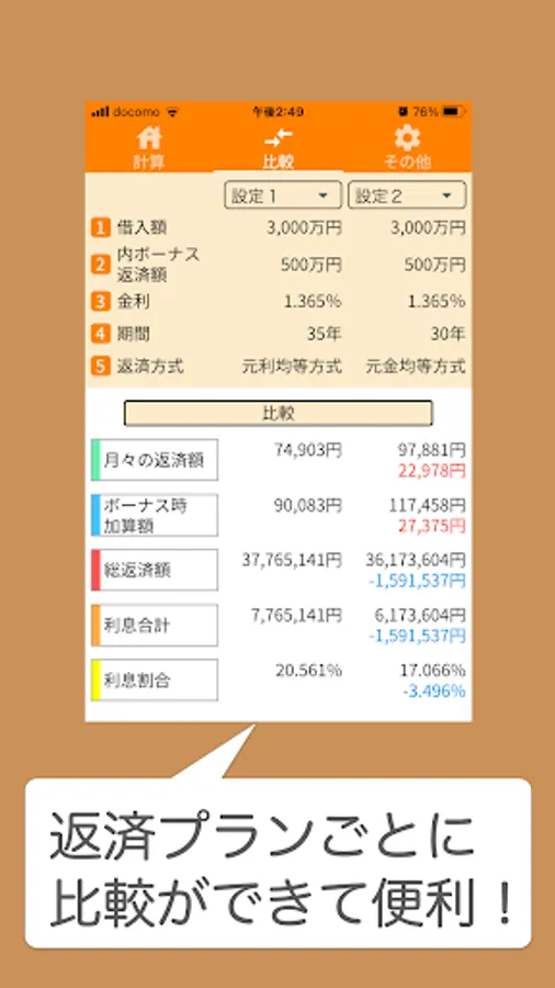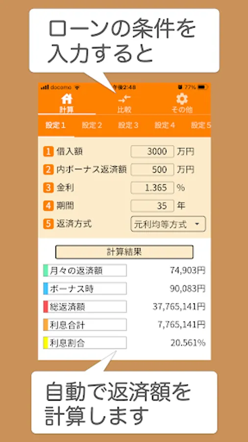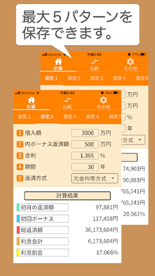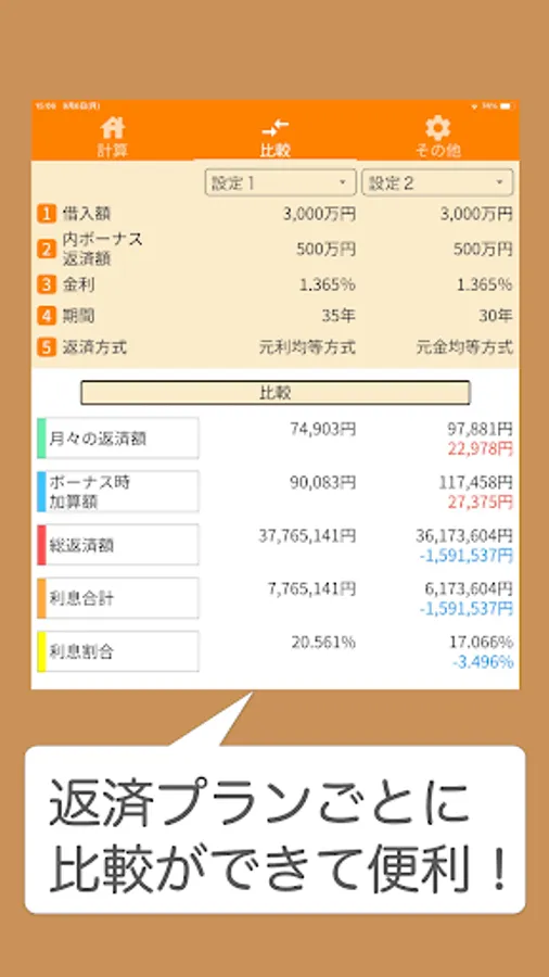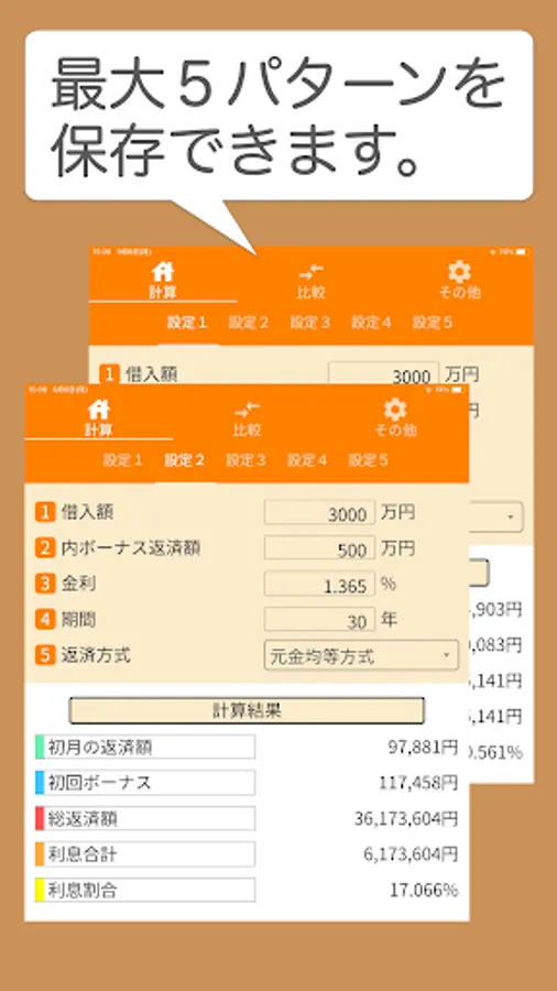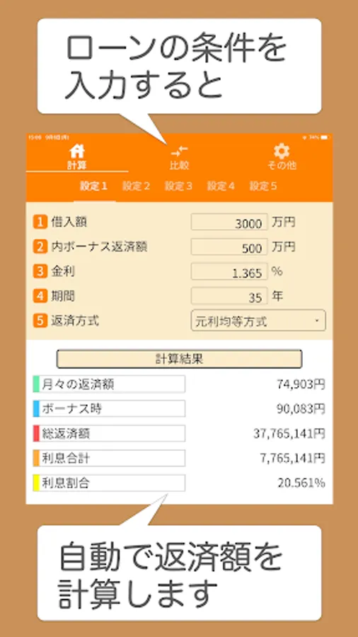 And you can save up to 5 patterns of mortgage settings and compare monthly repayments.