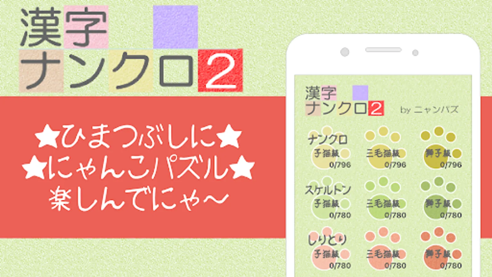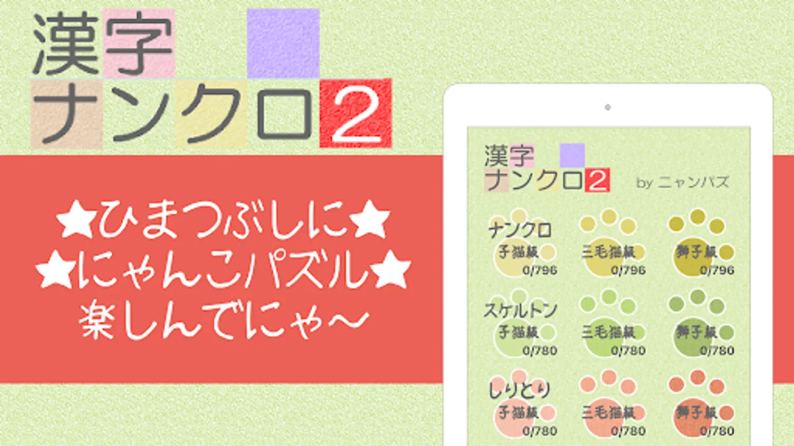 You can play 3 types of popular kanji puzzles: kanji nankuro, skeleton, and kanji shiritori. There are 3 levels of difficulty for each puzzle.