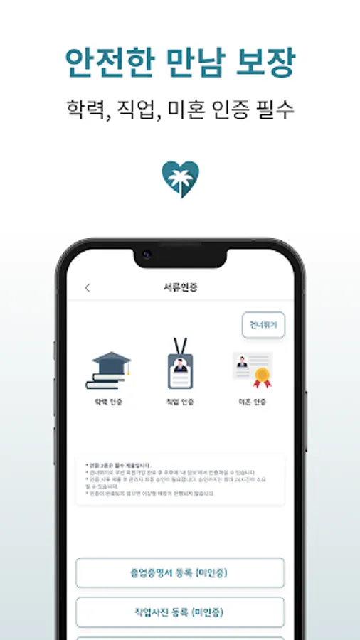 4. Safe meeting through mandatory submission of 3 types of certifications 3 types of mandatory member certifications (certification of educational background, certification of occupation, certification of single marriage) and secure meeting through inquiry of sexual crime history information.