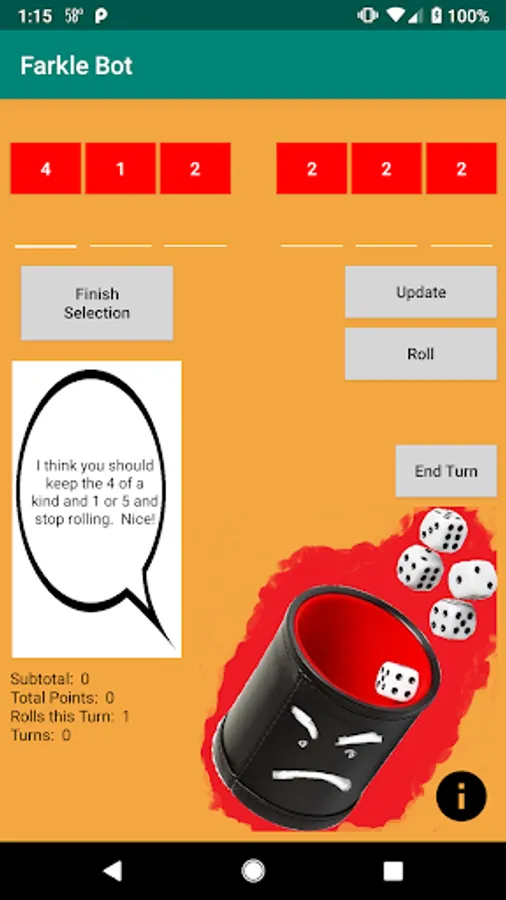 Farkle Bot will suggest to you the best possible move as you attempt to play the dice based game. You can choose to play without its suggestions but it will always tell you if you roll a "farkle" (getting zero sets, straights, or 1s and 5s in a single roll).