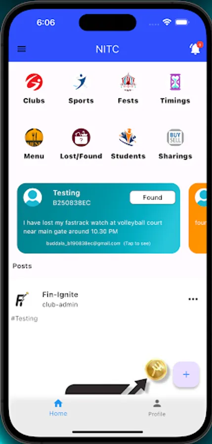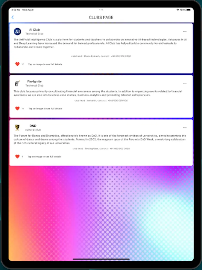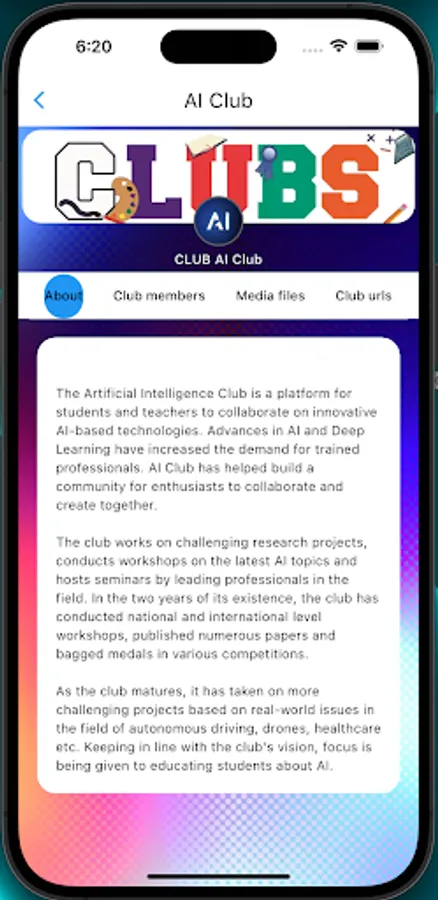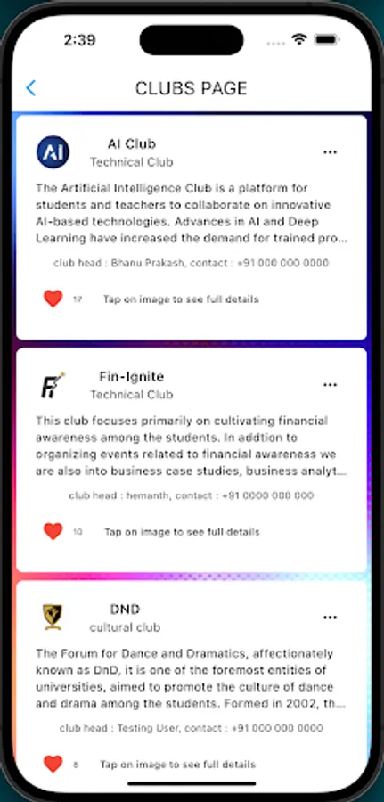 Clubs: The app has information about all the clubs and sports shared by the students, it will also provide their activities, and contact details, making it easier for you to stay informed about what's happening in clubs and sports.