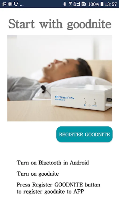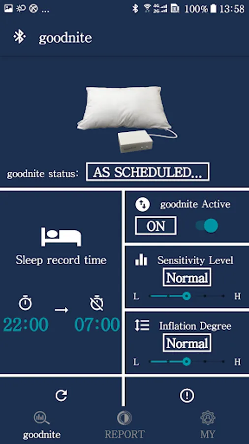 1) Bluetooth 4.x (BLE) connects to the Goodnite NT03-800 Smart Pillow
