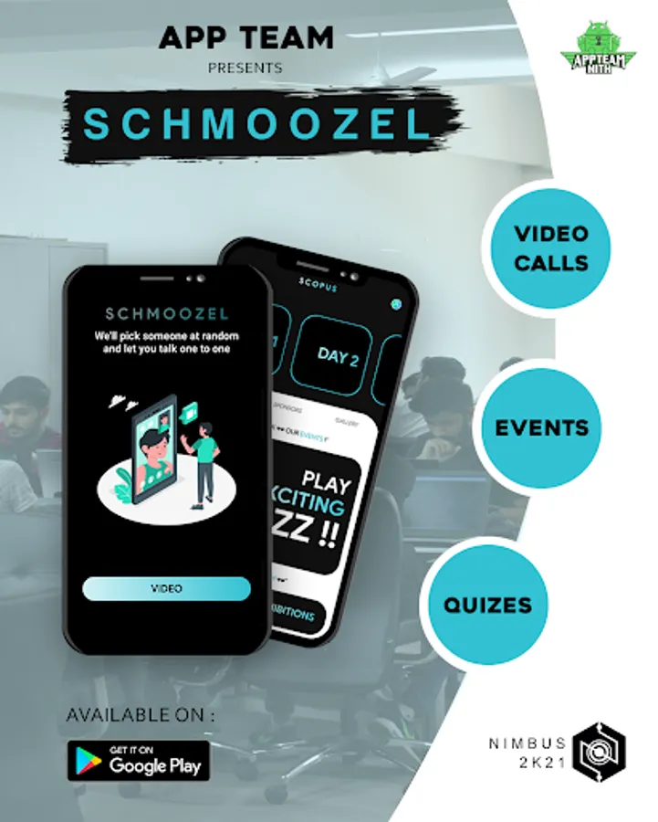 This app is the official app of the technical fest of the college, "NIMBUS 2k21". The app enlists details about numerous events, workshops, exhibitions, etc., that will be conducted during the fest. It also presents a schedule for the fest. The app gives details about the talks that will be delivered by leading people in the industry. All the other information related to the fest coordinators, sponsors, etc., are also provided by the application.