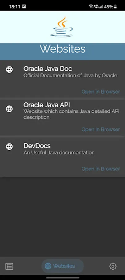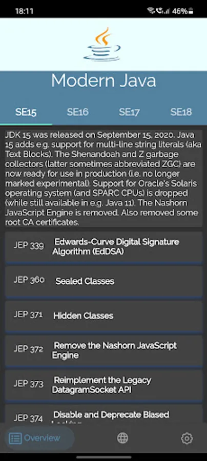 Modern Java contains latest java language features and description. SE15 , SE16, SE17, SE18 are the versions of java that are detailed in the App.