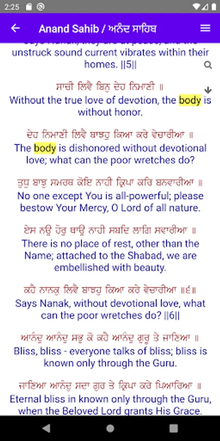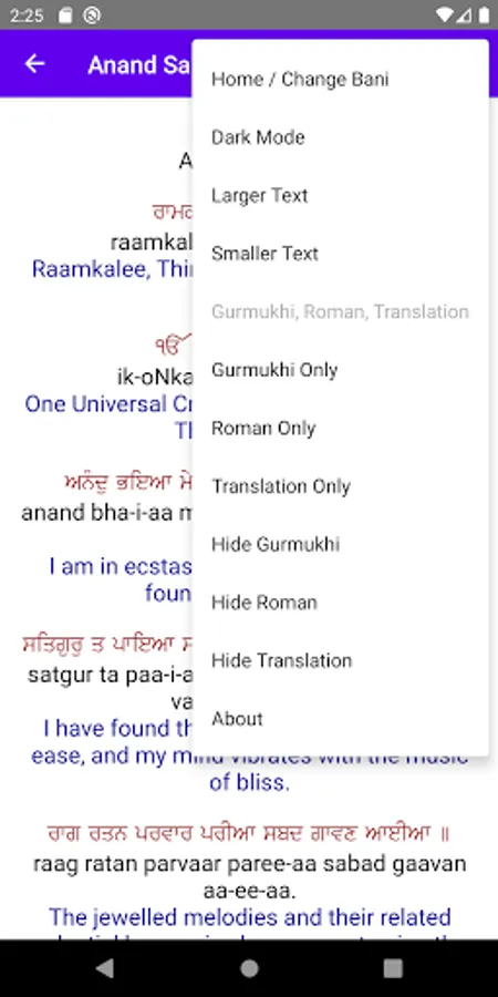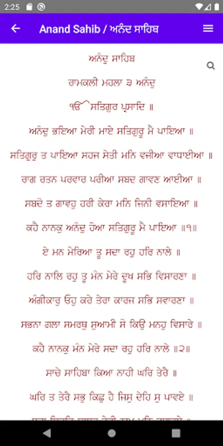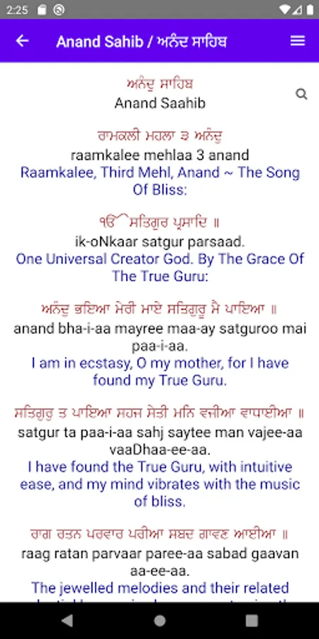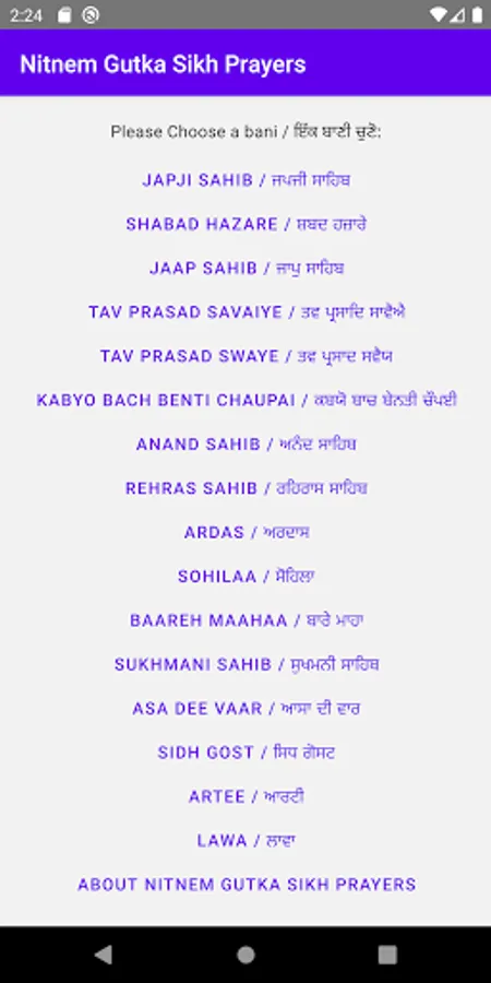 This is a simple, ad-free easy to use application that provides you with Nitnem Gutka Sikh Prayers in Gurmukhi (Punjabi), Romanized (Transliteration) and Translation texts. The menu lets you toggle night reading mode (black background that emits less light) and increase / decrease text size.