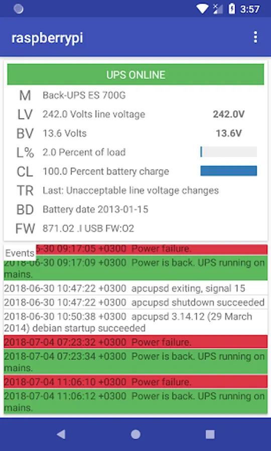 This is a simple, free and also ad free APCUPSD monitor application which can be used via SSH or NIS to pull information from your APCUPSD instances or from Eaton UPSes via using Eaton IPM software and its https web interface. I have developed this app for my own use with features I need so future features are up to users to ask. My personal usage for this is to monitor power outage logs easily.