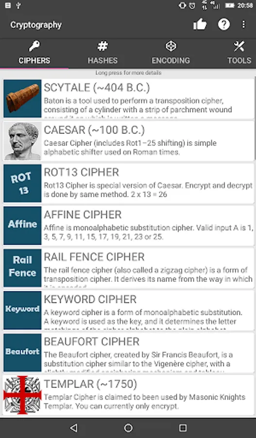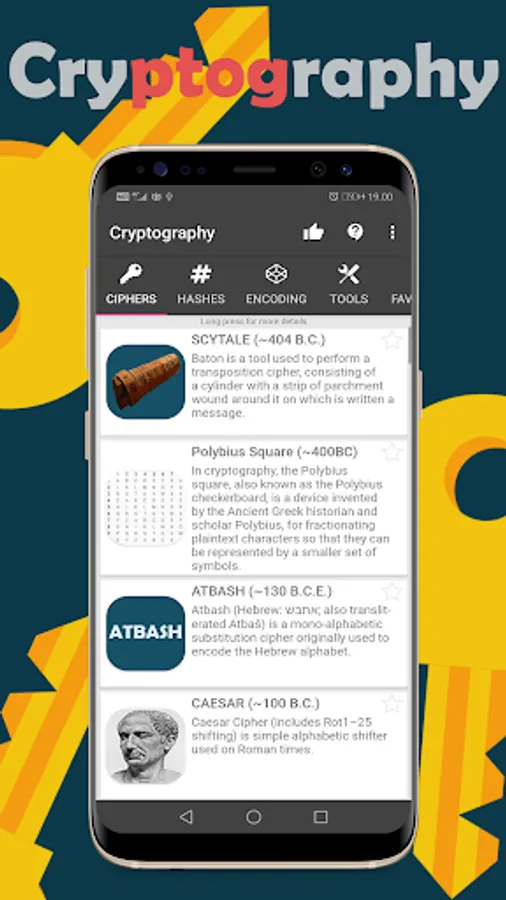Cryptography is a cipher, hashing, encoding and learning tool for all ages. Cryptography has also many tools from anagram solving to password generation. Download it now and see much more!