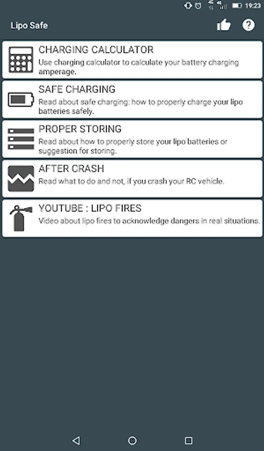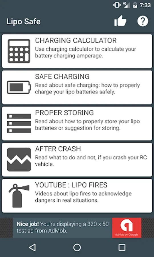 Lipo Safe is app that is meant to warn and give knowledge to people using Lipo batteries like me to remember how dangerous lipo batteries are. Also how people should store them and how to charge them properly to minimize possible injuries and house fires due Lipo fires. I made this app because I personally didn't really know about the dangers.