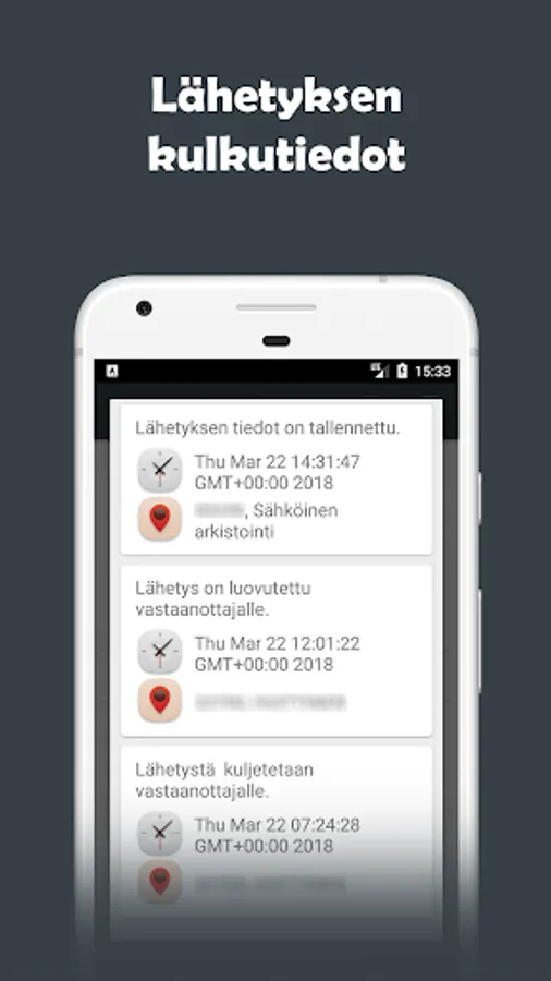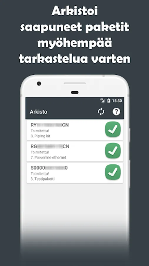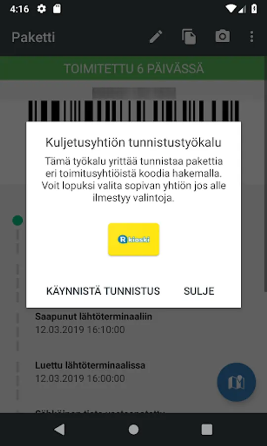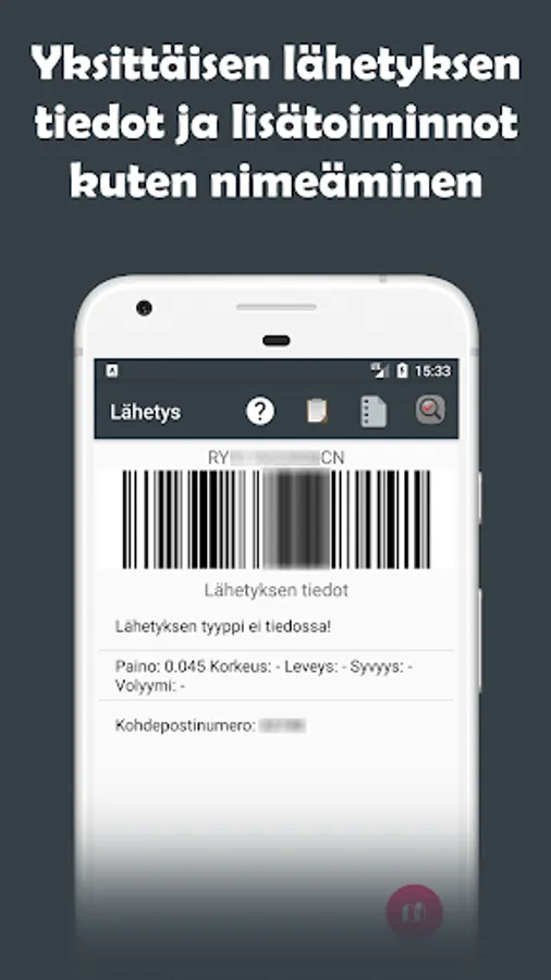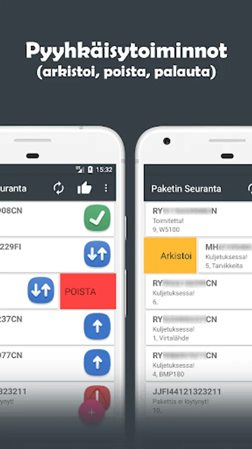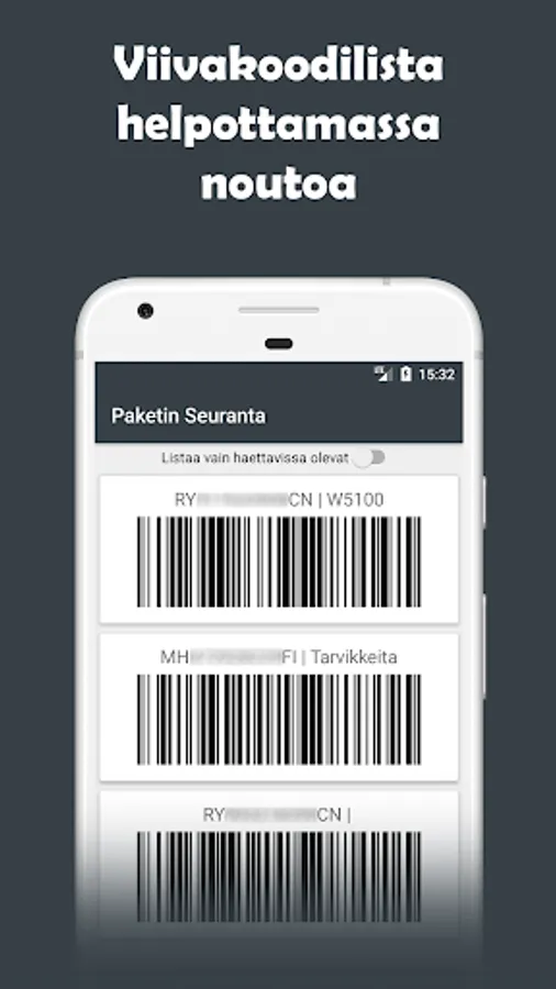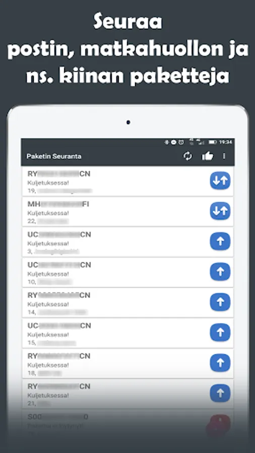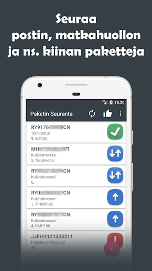 Posti, Matkahuolto, DHL, UPS, FedEx, PostNord, Ärrä Packages and China packages tracking application which has tons of features to help track multiple packages at once. It has barcodes, barcode lists. See features yourself by trying it out.