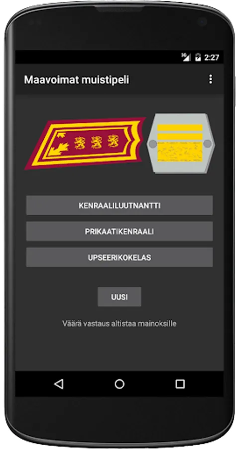Download the Suomen särmi application and learn the military ranks of the Finnish Defense Forces quickly with the Military Ranks Suomi application and avoid possible interview mistakes. Stop calling Major Vänrik or vice versa. The main idea of the application is a memory game, the purpose of which is to enhance and facilitate the learning of values.