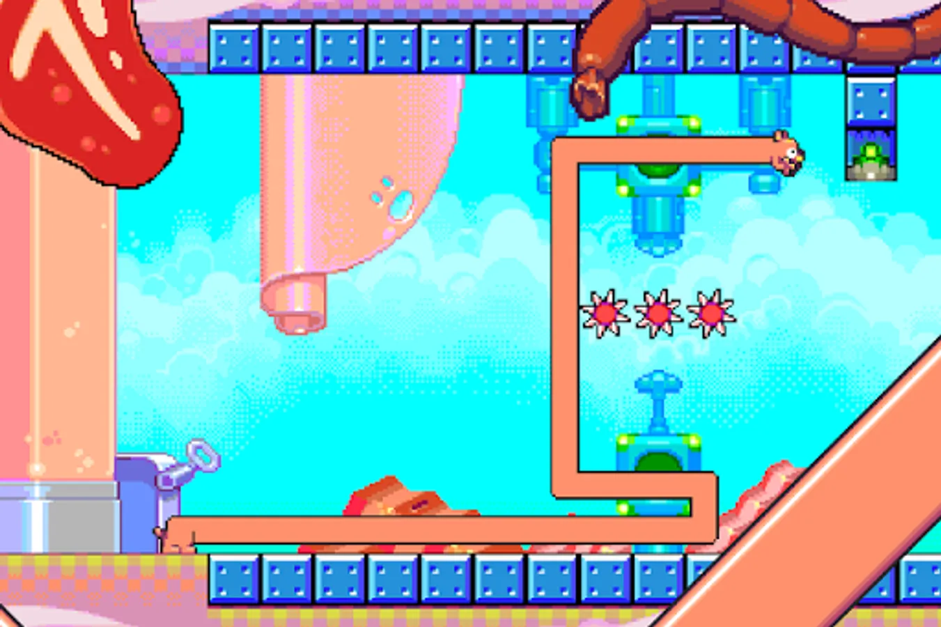 Having an infinitely stretchy body is pretty handy!....but it's not all plain sailing. Your exposed body is vulnerable to all sorts of meat cutting instruments so don't over stretch yourself or you could end up butchered!