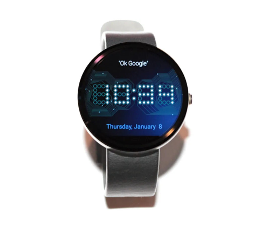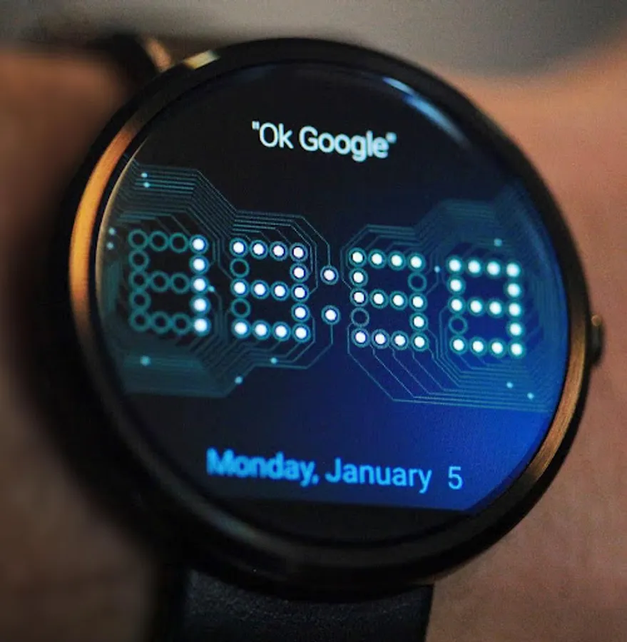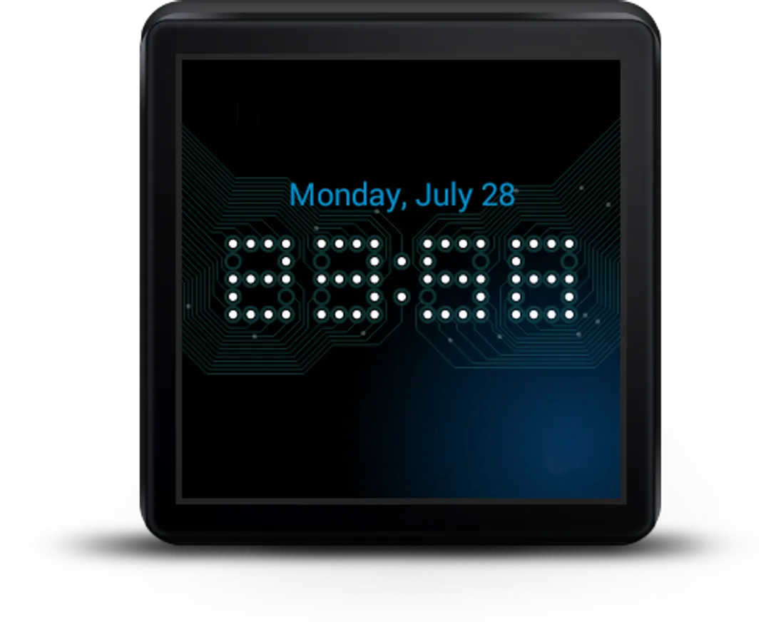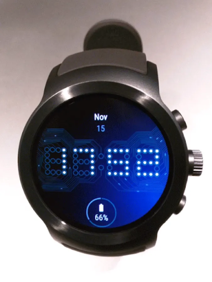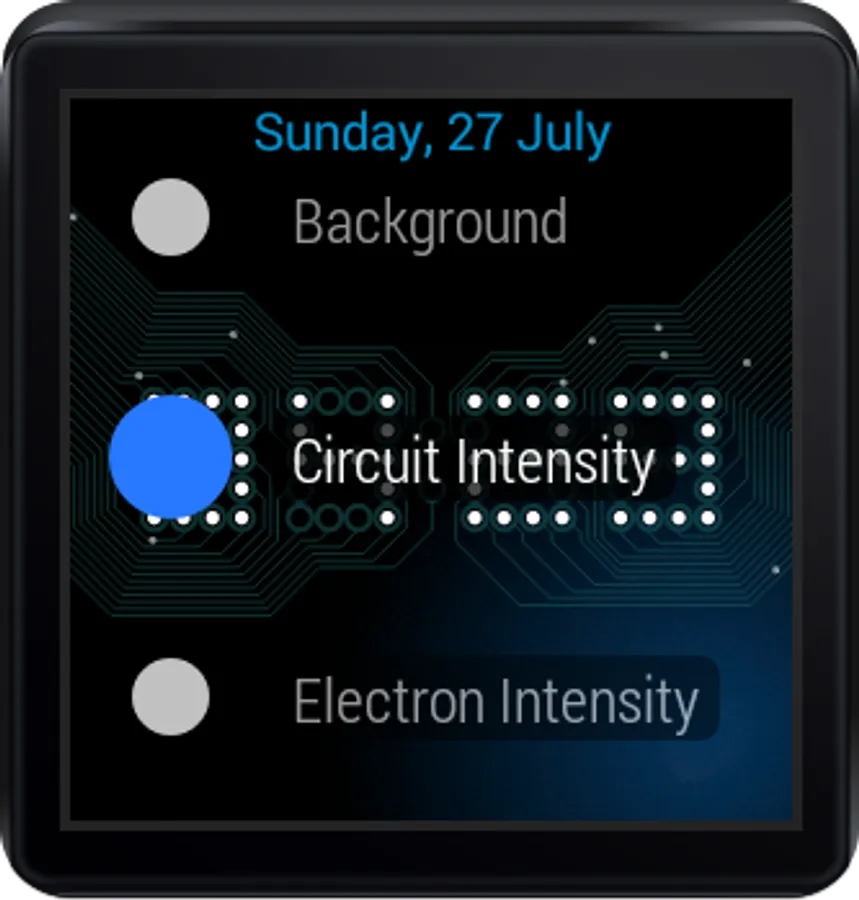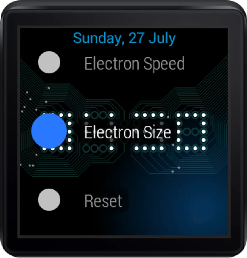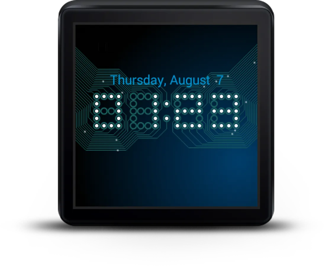 This is a custom watch face for watches running Android Wear that displays a circuit board with animated flowing electrons!