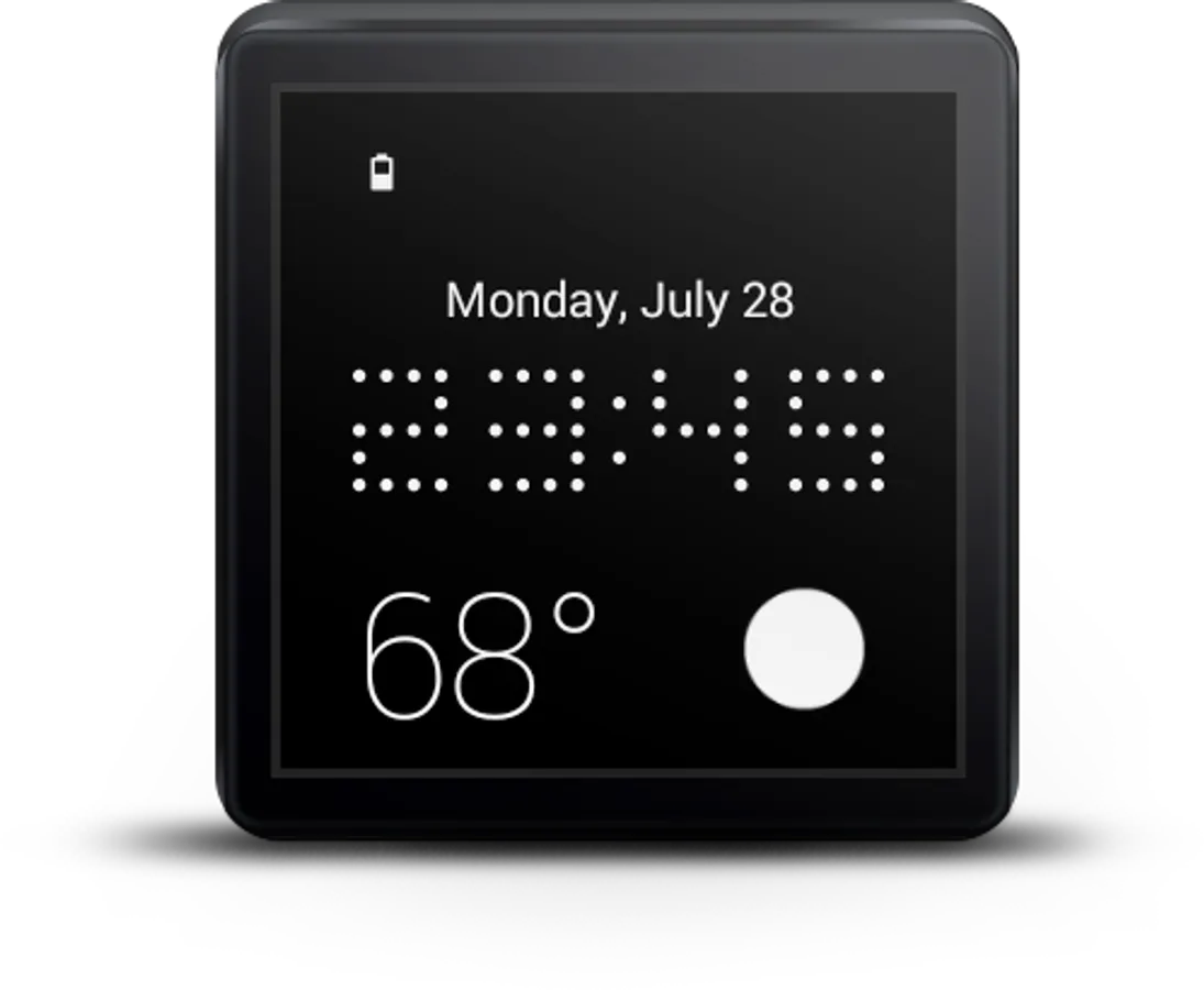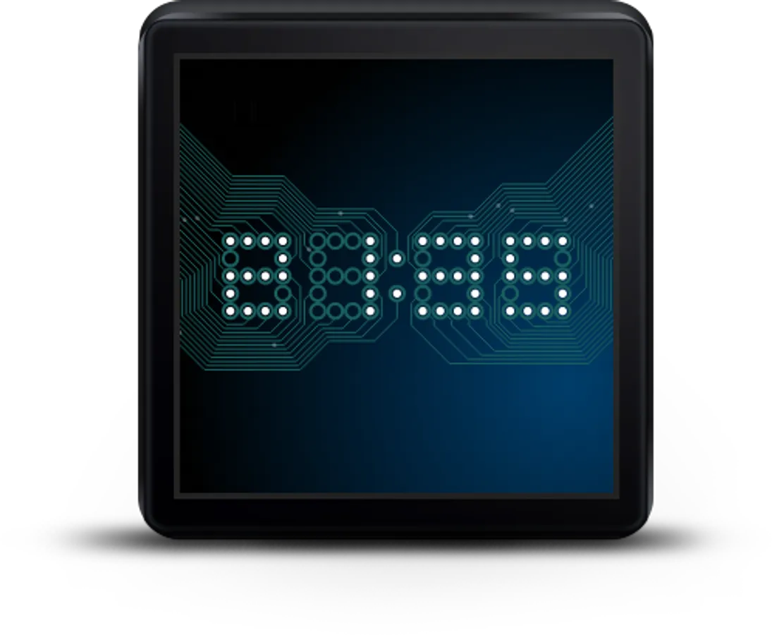 During normal operation, the watch face consumes minimal CPU (and therefore battery) by displaying a simple dot-matrix display clock. When you touch the watch face, the screen is illuminated to reveal the circuit with flowing electrons.