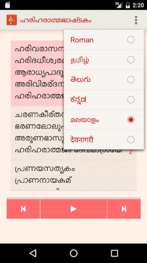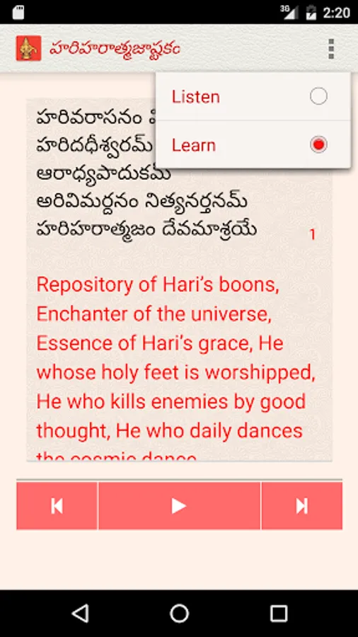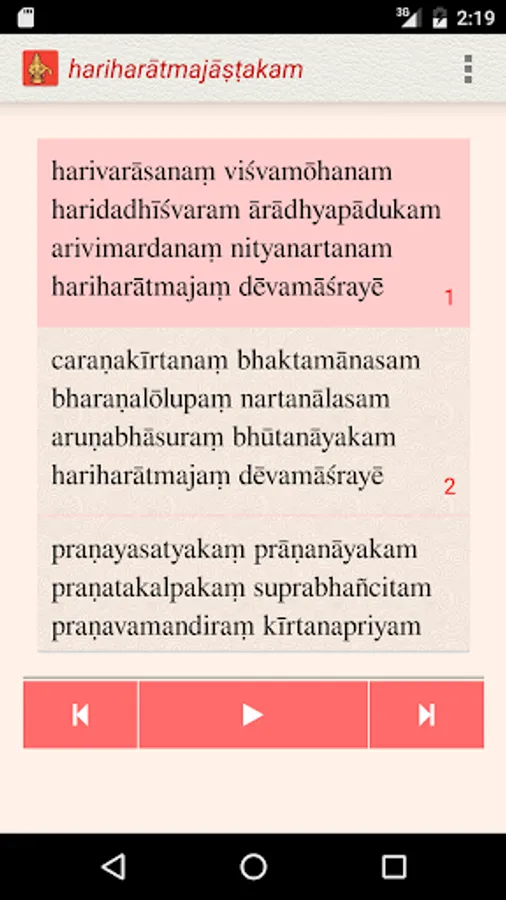 The Hariharatmajashtakam app, under the NityaŚlokas collection, is a creation of ThirdEye Apps.The app has been created with the intention of making it easier for children and adults equally, to learn traditional slokas (verses) and their meaning. The app includes the following features