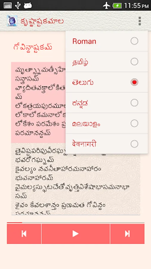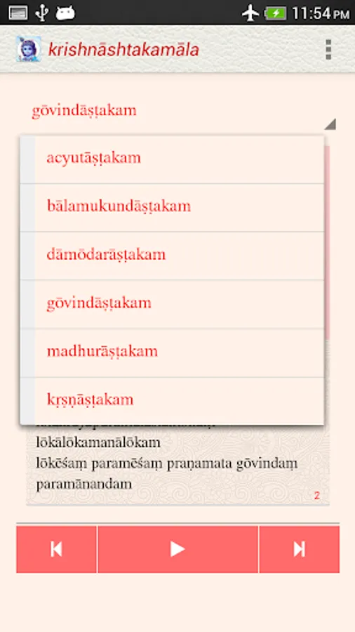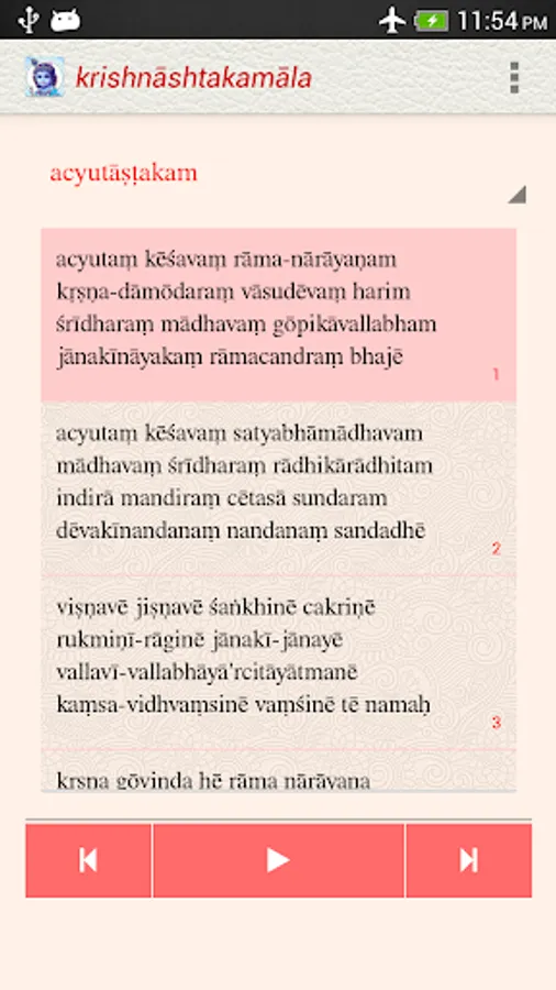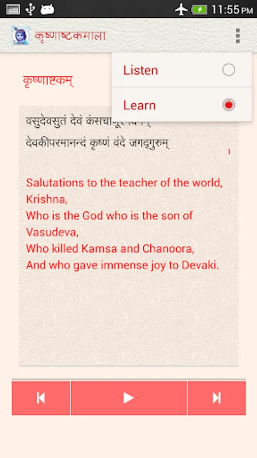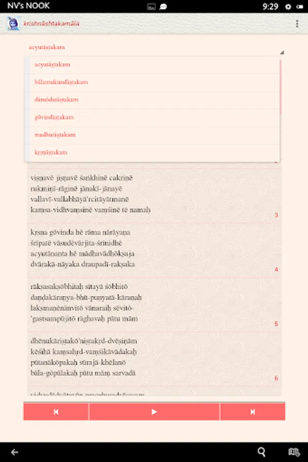 The Krishnashtakamala app, under the NityaŚlokas collection, is a creation of ThirdEye Apps.The app has been created with the intention of making it easier for children, to learn traditional slokas (verses) and includes the following features