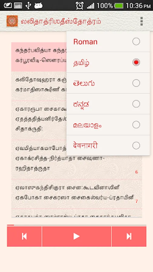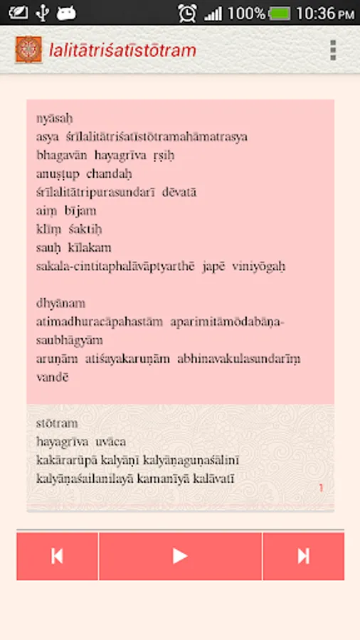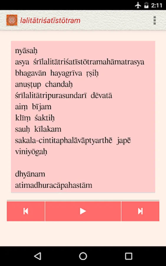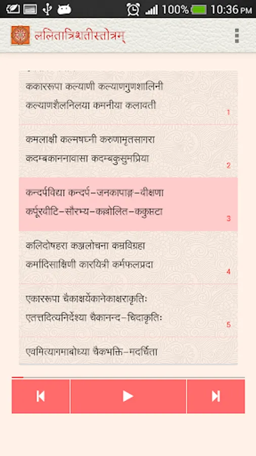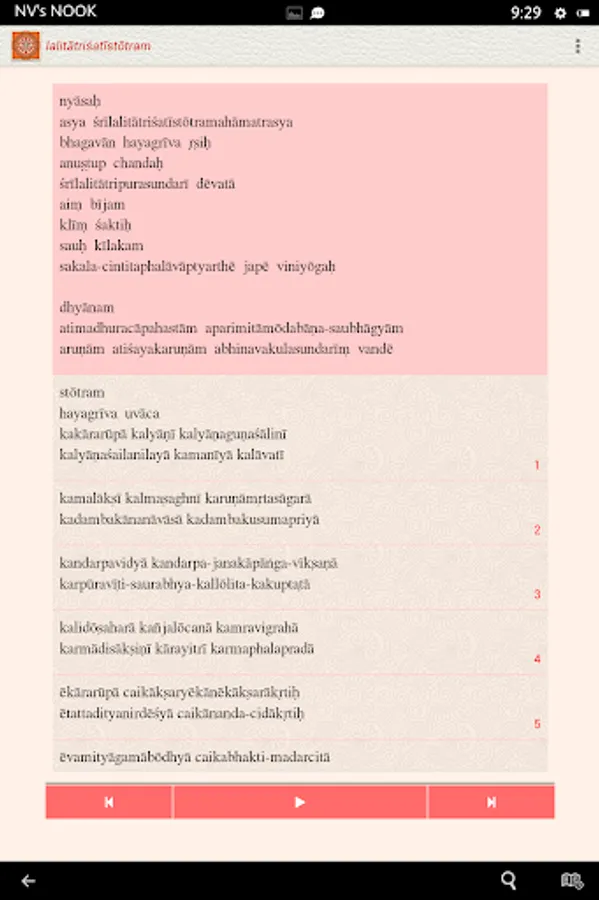 The Lalita Trishati app, under the NityaŚlokas collection, is a creation of ThirdEye Apps.The app has been created with the intention of making it easier for children and adults equally, to learn traditional slokas (verses) and includes the following features
