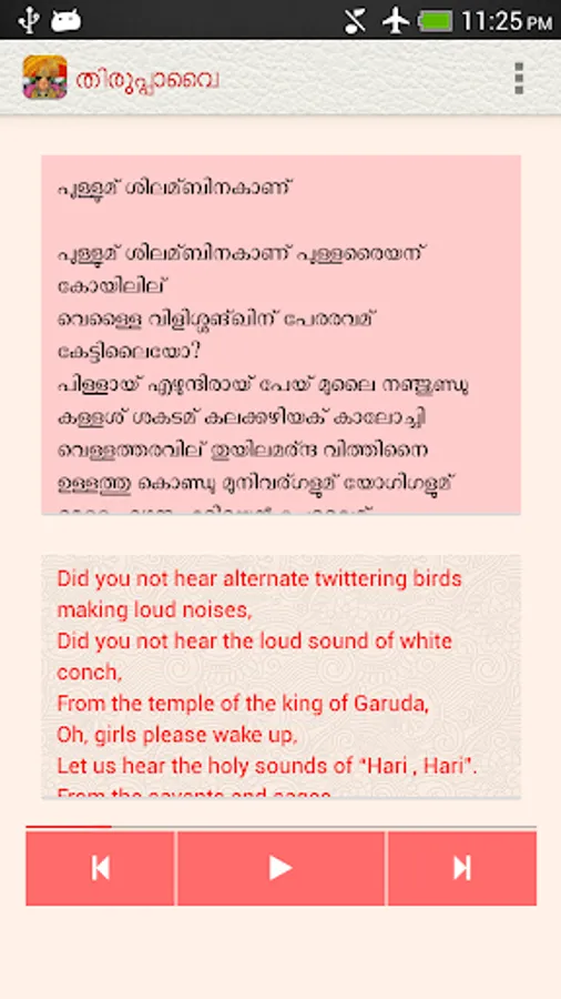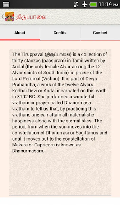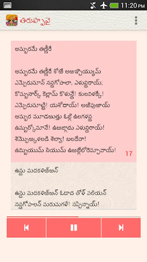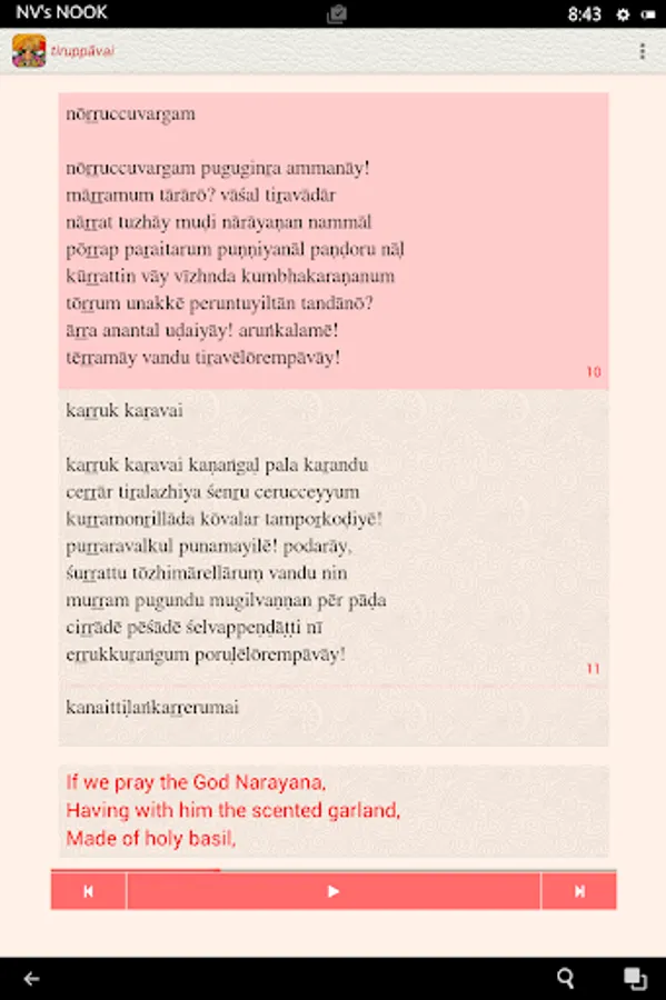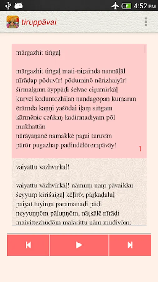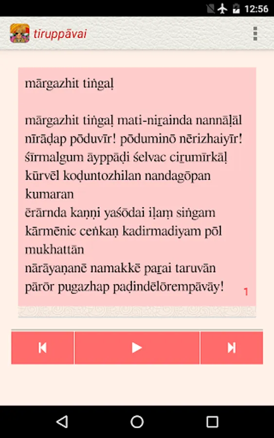 The Tiruppavai app, under the NityaŚlokas collection, is a creation of ThirdEye Apps.The app has been created with the intention of making it easier for children and adults equally, to learn traditional slokas (verses) and includes the following features