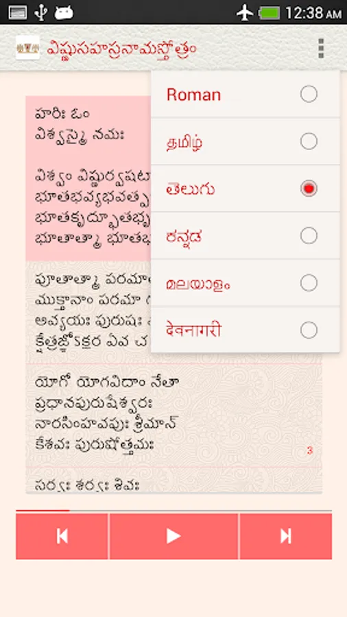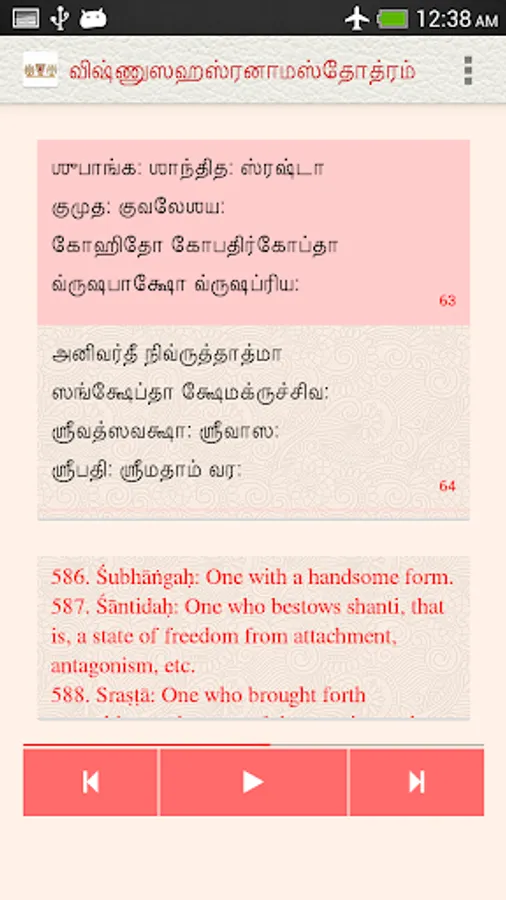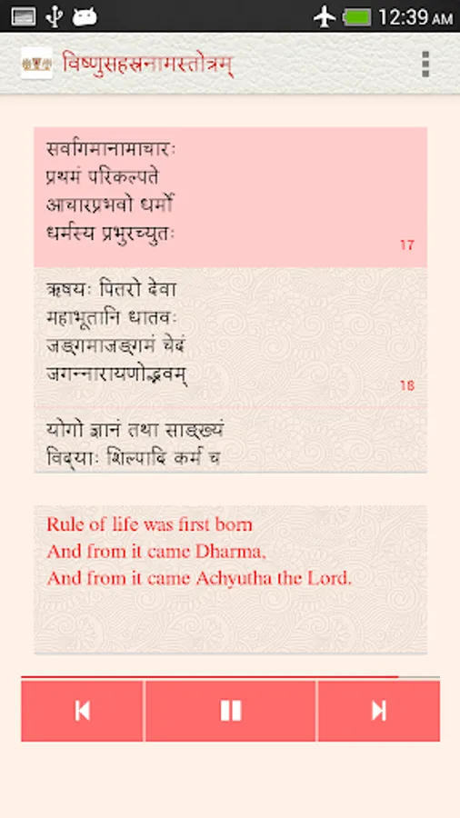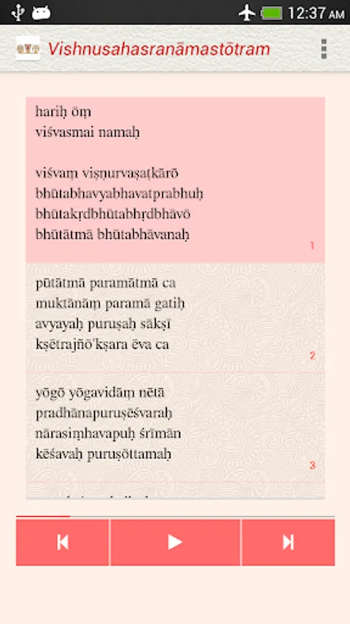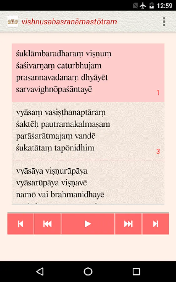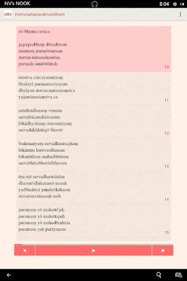 The Vishnu Sahasranama Stotram app, under the NityaŚlokas collection, is a creation of ThirdEye Apps.The app has been created with the intention of making it easier for children and adults equally, to learn traditional slokas (verses) and includes the following features
