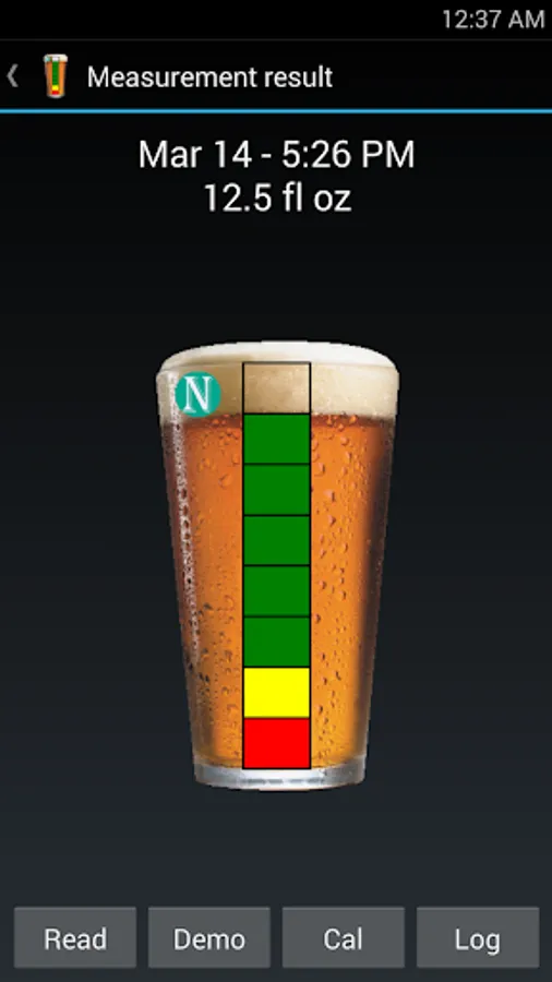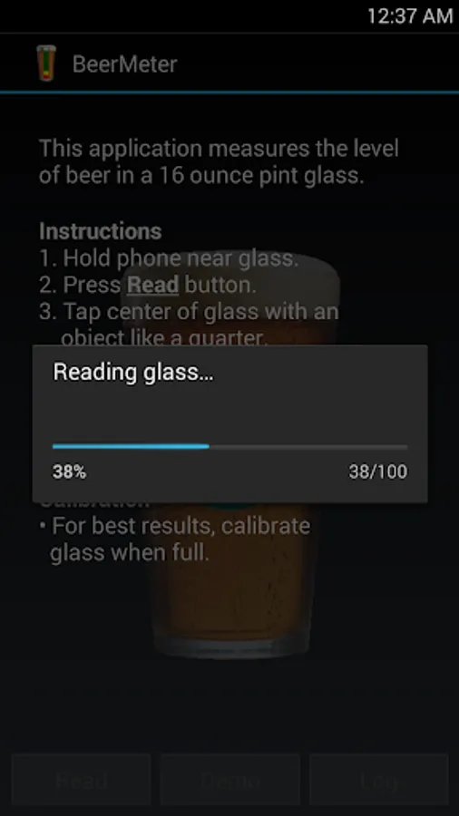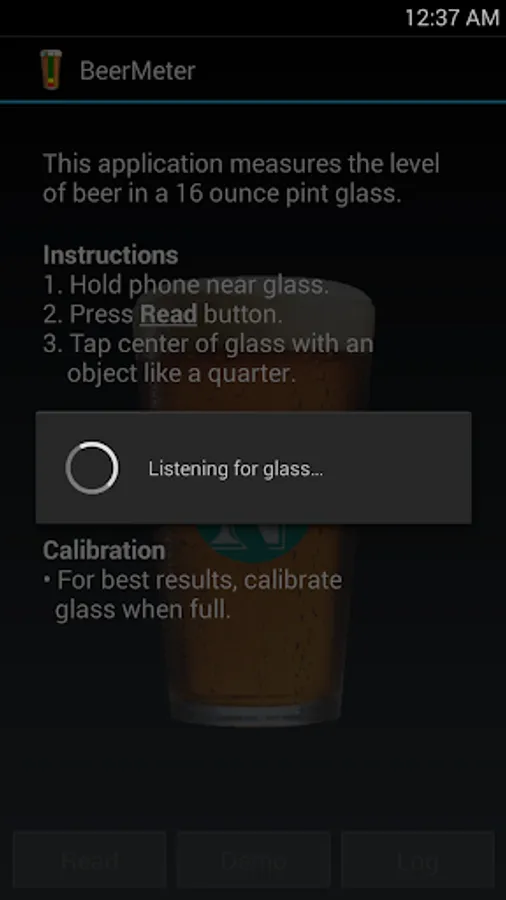 Download and install the BeerMeter app. Fill the glass with beer, water or a soft drink. Hold your Android device near the glass (6 inches or less). Start the BeerMeter app and press the "Read" button. Wait until you see the message “Listening for glass” and then firmly strike the center of the glass with a hard object such as a quarter, spoon or key, so that the glass rings like a bell. Once BeerMeter hears the sound of the glass, it will complete the measurement and graphically display the result. If BeerMeter does not respond when the glass is struck, strike the glass again.