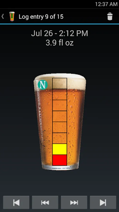 BeerMeter stores up to 100 previous measurements in a log file. Press the "Log" button to view previous tests. Navigate the log file by pressing the arrow buttons and delete entries by pressing the "Trash" icon in the Action Bar.