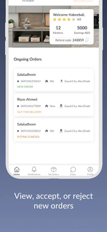 The dashboard allows you to keep track of all your past and incoming orders in one place. Accept/Reject the orders based on your convenience.