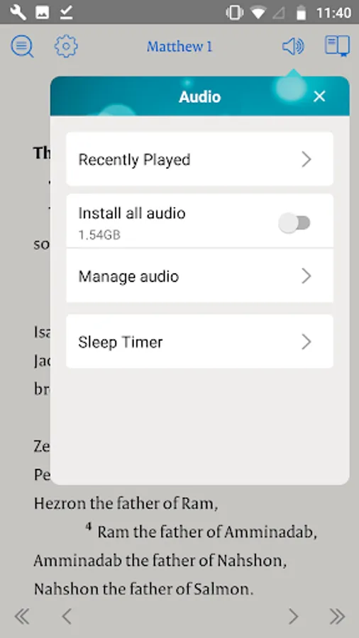 - Manage the audio content held on your device: download all at once, or section by section. E.g. Download Genesis-Deuteronomy and when you no longer need, it send it back to the cloud.