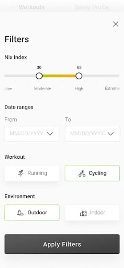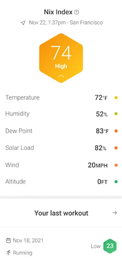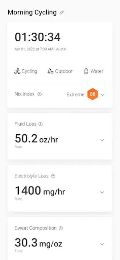 Before your workout, tell the Nix app if you’re running or cycling, and what you’ll be hydrating with. You can also consult the Nix Index to see how your environment - factors like the temperature, humidity, altitude - might impact your hydration needs.