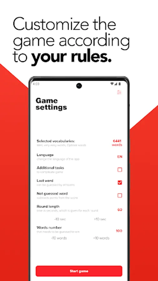 You can customize the game by changing the duration of the round and the required number of words for victory. Plus, the app features pre-made pictures for team avatars and names, but you can also customize these to your liking.