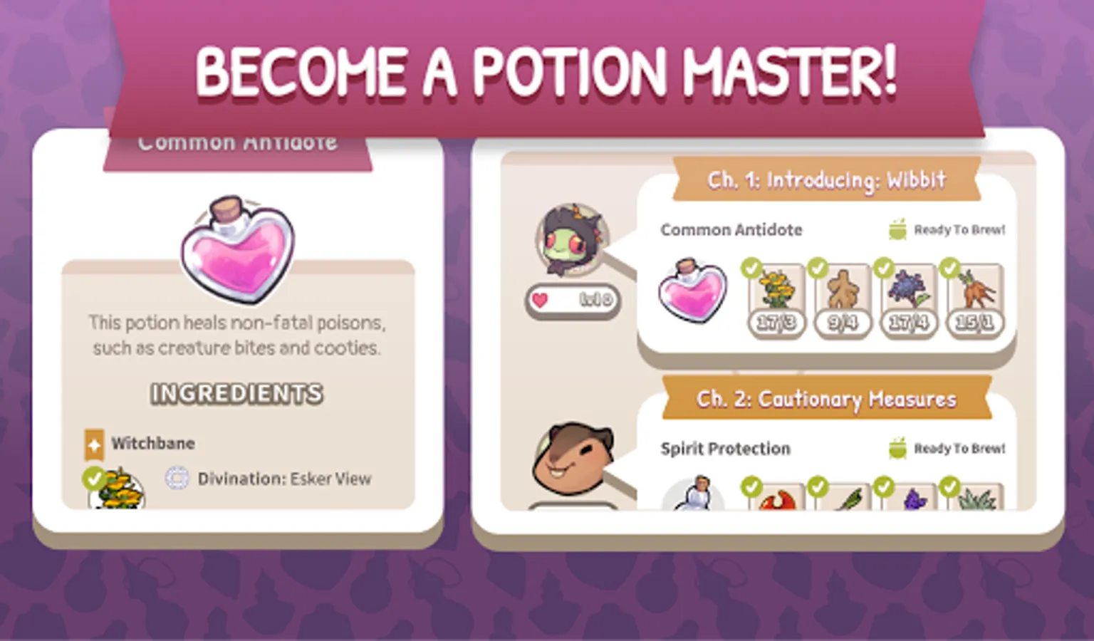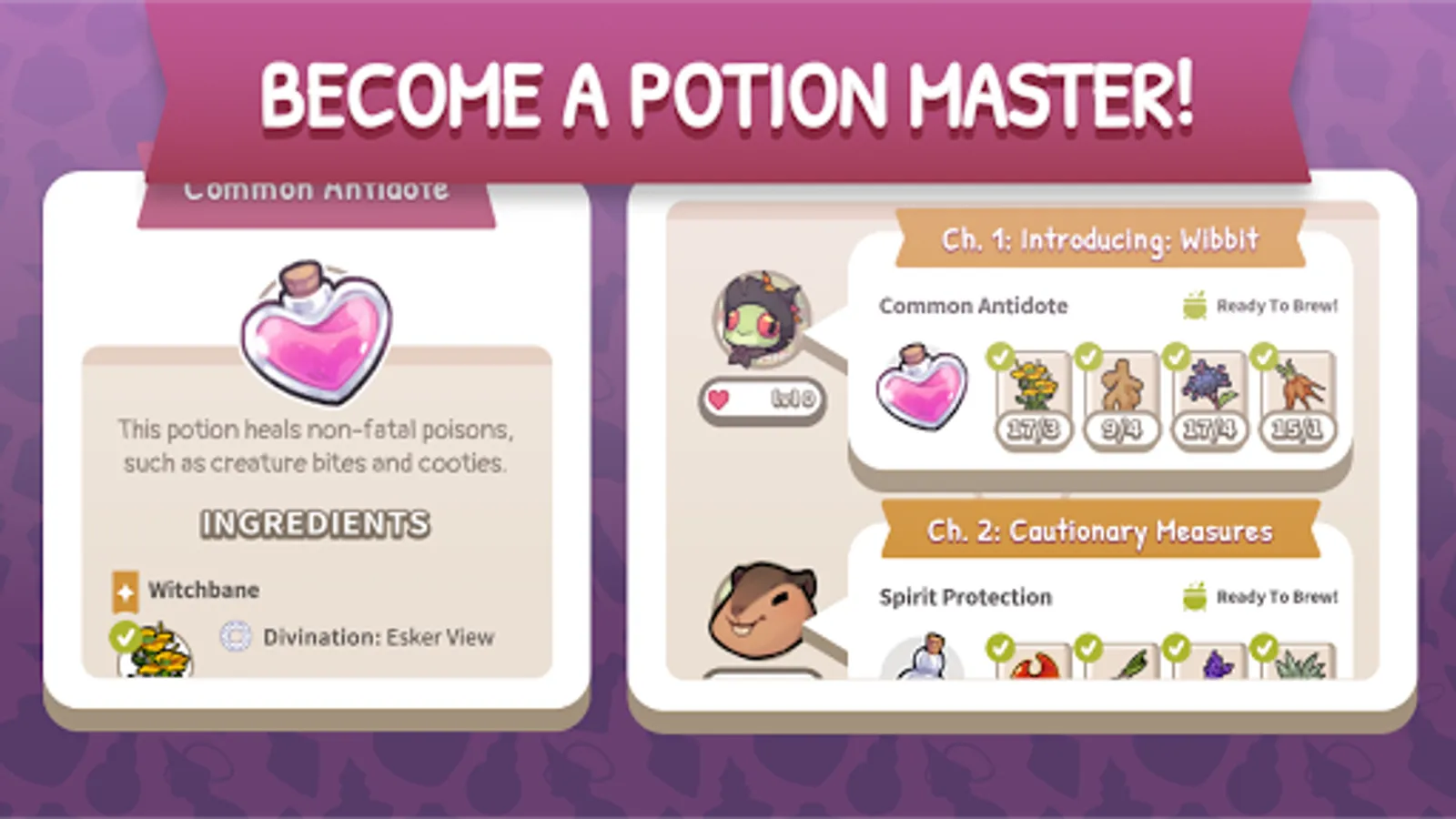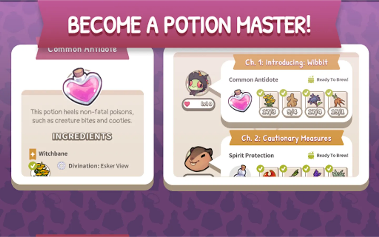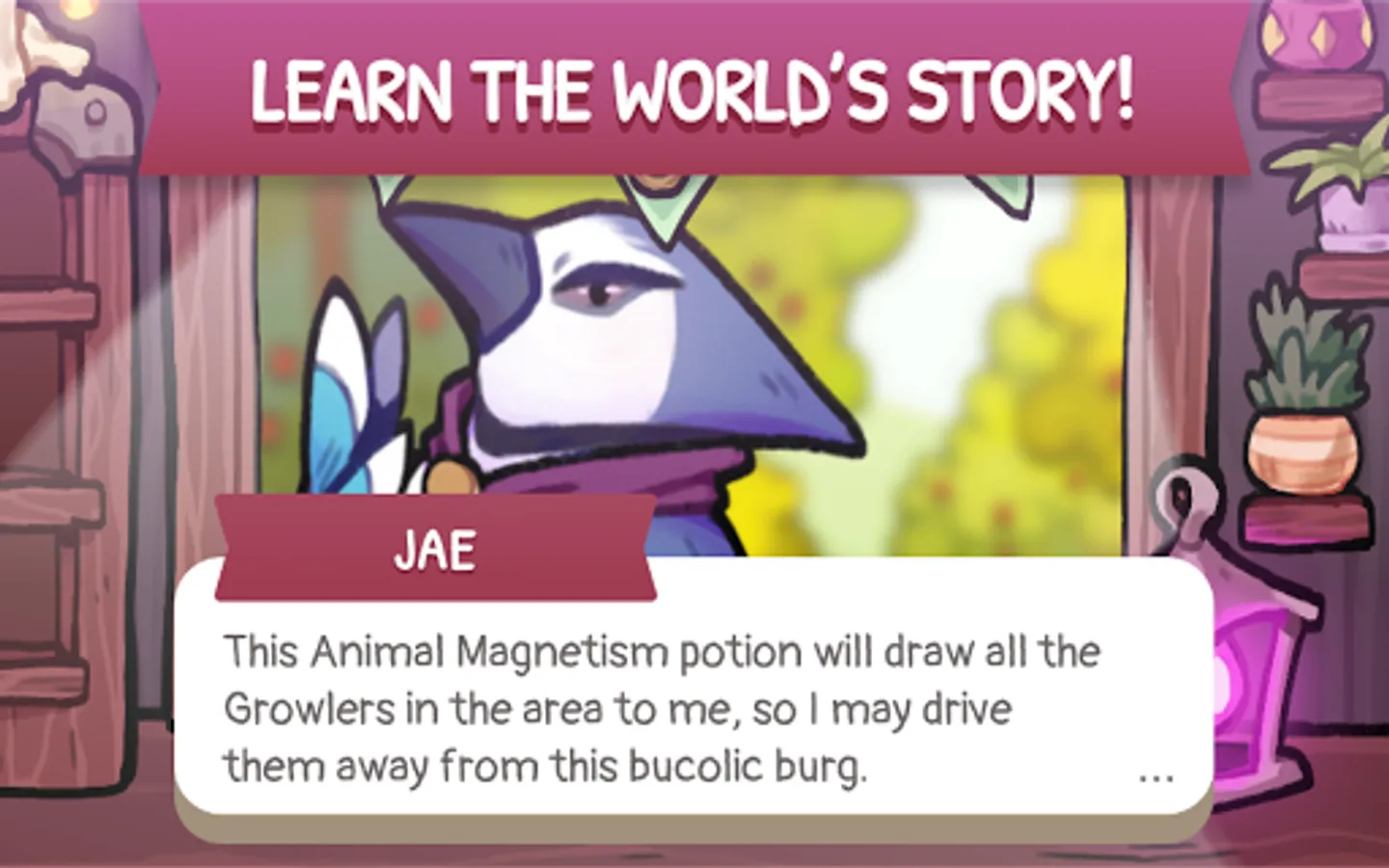 Basil, Latte, Oli, and more curious creatures live in Esker View, each with their own unique story. As you bond with them, you’ll learn more about them. They need YOU, the Potion Maker, to help them overcome challenges and find success!