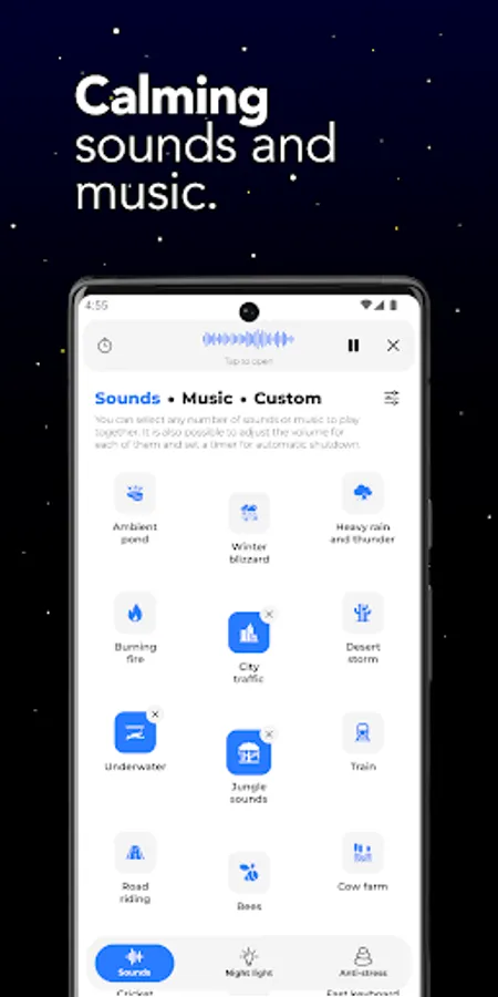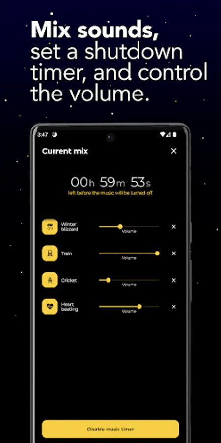 Experience a variety of relaxing sounds and music designed to soothe your mind and help you drift off to sleep faster. You can mix and match different sounds and adjust their volume to create your perfect atmosphere. Plus, with the ability to record your own sounds, music, or even fairytales, you can create a truly personalized experience. And with the built-in shutdown timer, you can set the app to turn off automatically, ensuring you don't disturb your sleep.